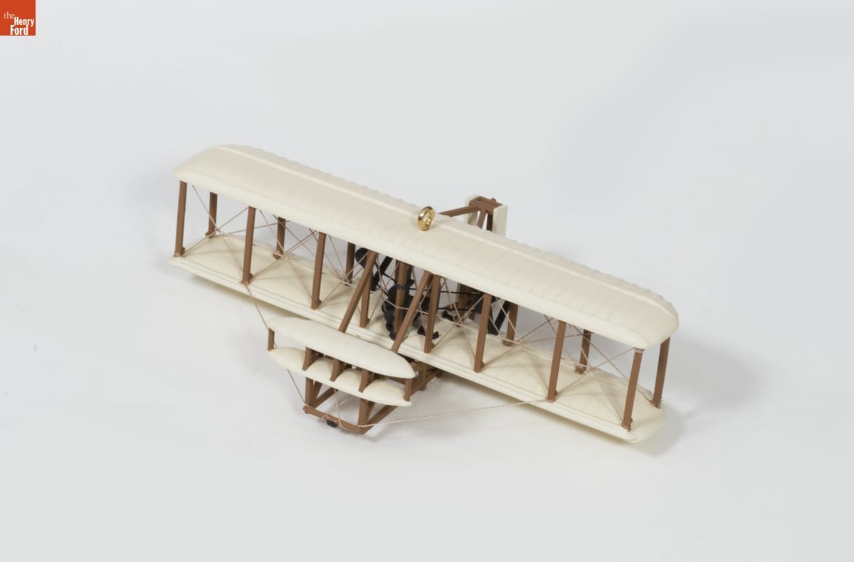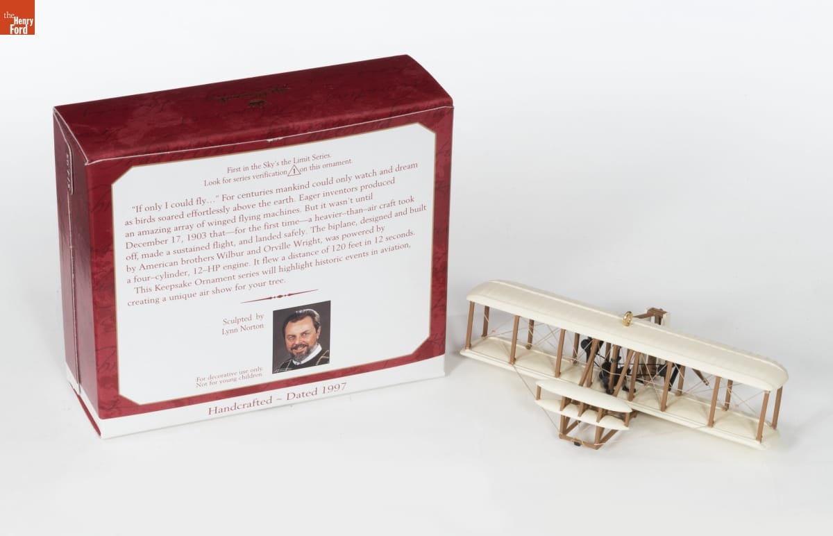 First in the Sky's the Limit Series. / Look for series verification 1 on this ornament. / "If only I could fly..." For centuries mankind could only watch and dream as birds soard effortlessly above the earth. Eager inventors produced an amazing array of winged flying machines. But it wasn't until December 17, 1903 that --for the first time--a heavier-than-air craft took off, made a sustained flight, and landed safely. The biplane, designed and build by American brothers Wilbur and Orville Wright, was powered by a four-cylinder, 12-HP engine. It flew a distance of 120 feet in 12 seconds. / This Keepsake Ornament series will highlight historic events in aviation, creating a unique air show for your tree. / Sculpted by Lynn Norton / For decorative use only. / Not for young children. / Handcrafted - Dated 1997