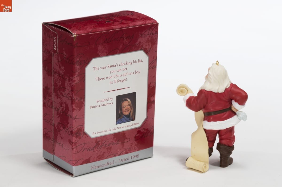 The way Santa's checking his list, you can bet There won't be a girl or a boy he'll forget! / Sculpted by Patricia Andrews / For decorative use only. Not for young children. / Handcrafted - 1998