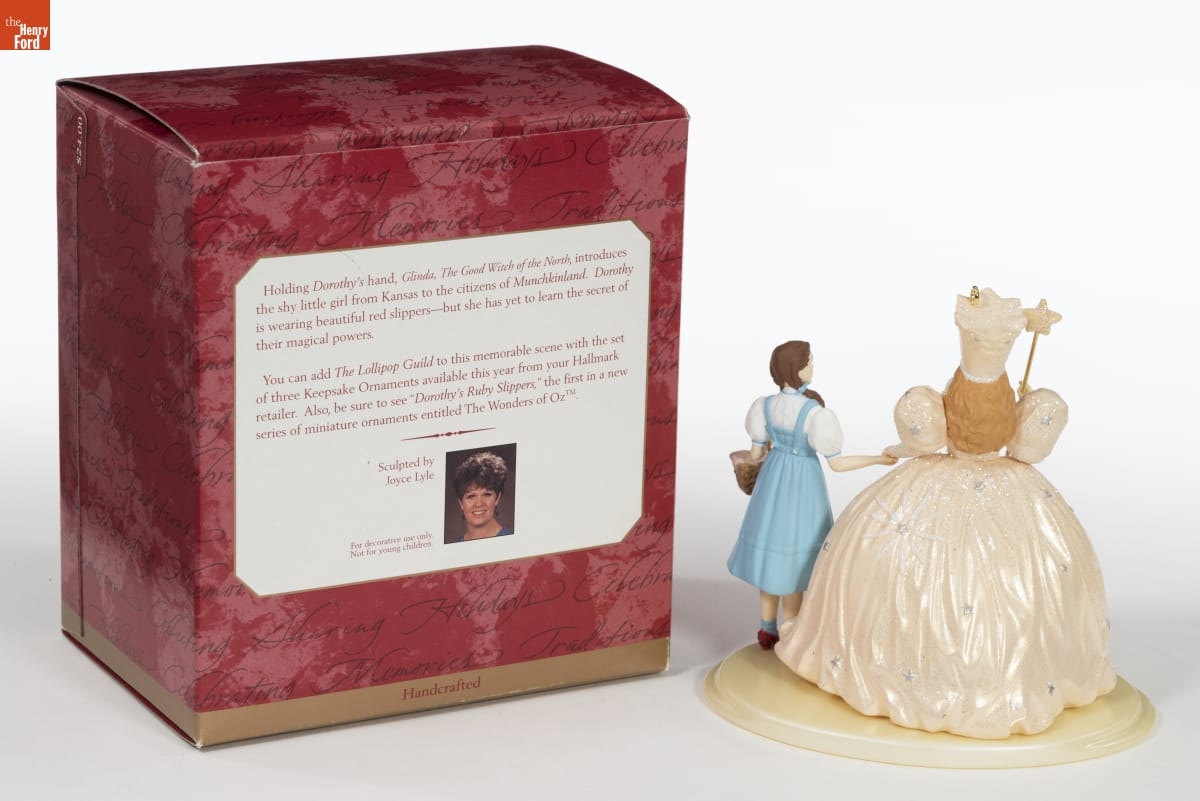 Holding Dorothy's hand, Glinda, The Good Witch of the North, introduces the shy little girl from Kansas to the citizens of Munchkinland. Dorothy is wearing beautiful red slippers--but she has yet to learn the secret of their magical powers. / You can add The Lollipop Guild to this memorable scene with the set of three Keepsake Ornaments available this year from your Hallmark retailer. Also, be sure to see "Dorothy's Ruby Slippers," the first in a new series of miniature ornaments entitled The Wonders of Oz. / Sculpted by Joyce Lyle / For decorative use only. / Not for young children. / Handcrafted