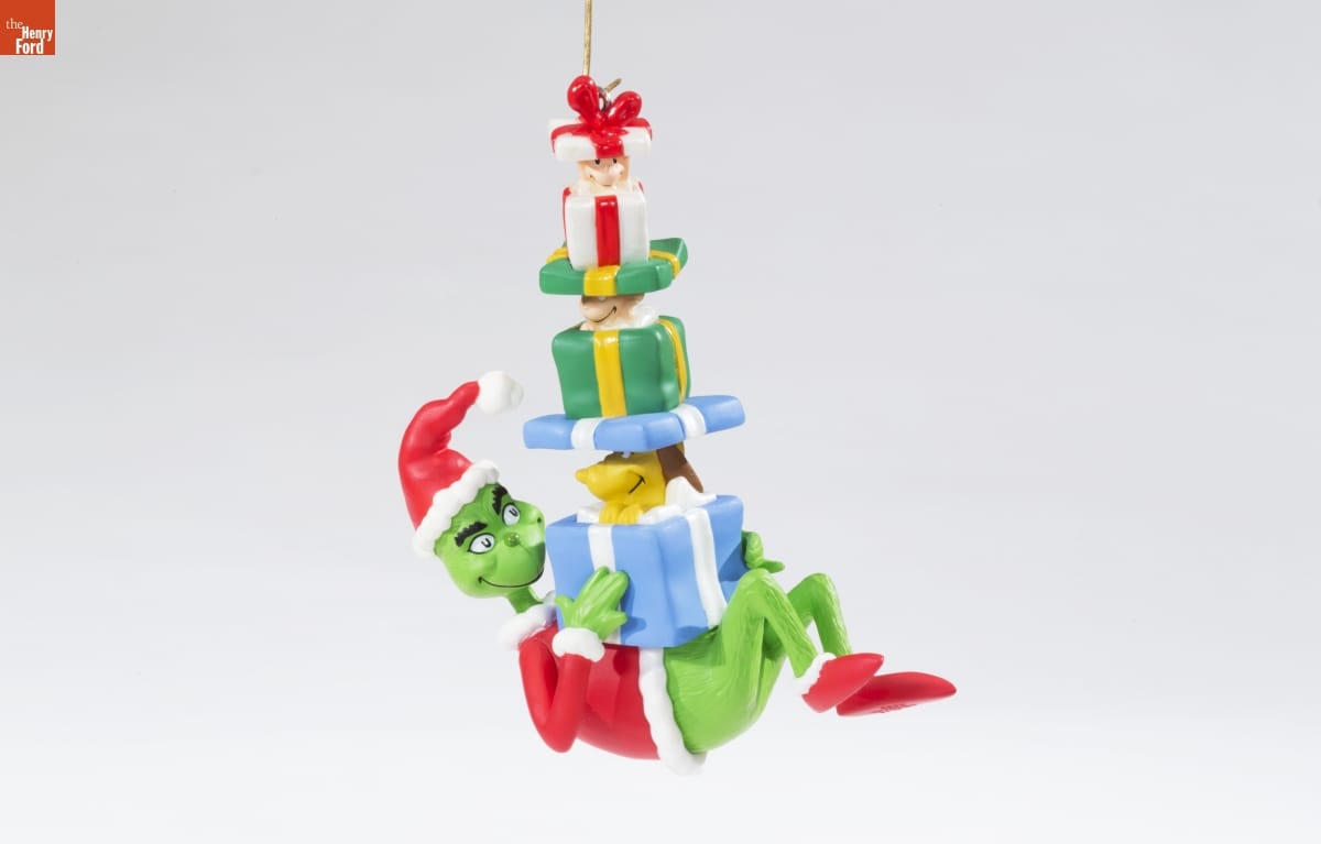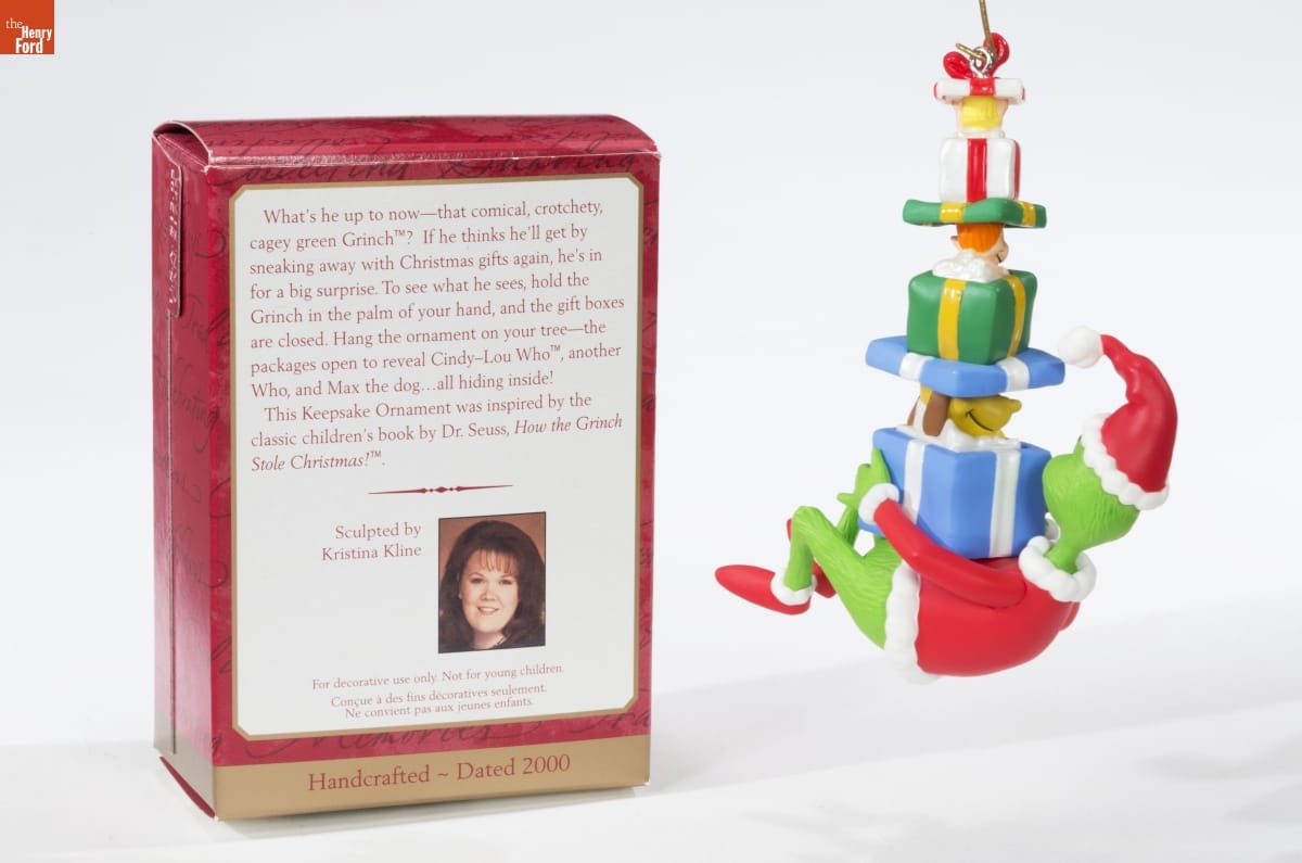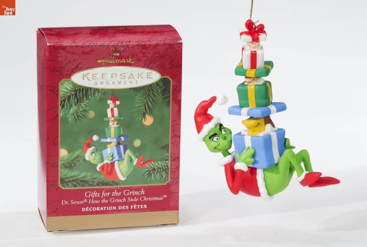 Dr. Seuss's children's book, How the Grinch Stole Christmas, inspired this ornament. Its 1966 animated television special would make watching the grumpy, sly Grinch's unsuccessful attempt to ruin the Whos' Christmas a perennial holiday tradition for many. Held in your palm, the Grinch's gift boxes are closed. Hung on a tree, the presents open to reveal Cindy-Lou Who, another Who, and Max the dog.