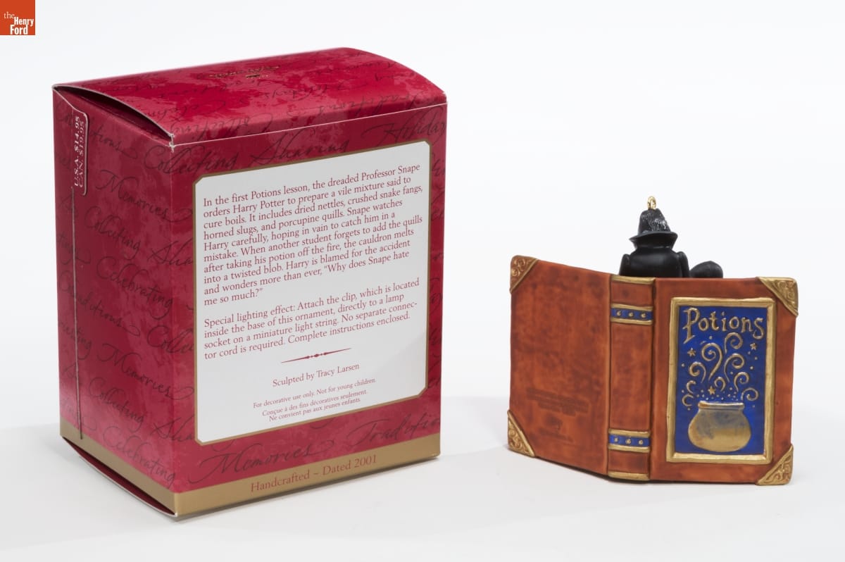 In the first Potions lesson, the dreaded Professor Snape orders Harry Potter to prepare a vile mixture said to cure boils. It includes dried nettles, crushed snake fangs, horned slugs, and porcupine quills. Snape watches Harry carefully, hoping in vain to catch him in a mistake. When another student forgets to add the quills after taking his potion off the fire, the cauldron melts into a twisted blob. Harry is blamed for the accident and wonders more than ever, " Why does Snape hate me so much?" / Special lighting effect: Attach the clip, which is located inside the base of this ornament, directly to a lamp socket on a miniature light string. No separate connector cord is required. Complete instructions enclosed. / Sculpted by Tracy Larsen / For decorative use only. Not for young children. / [...] / Handcrafted - Dated 2001