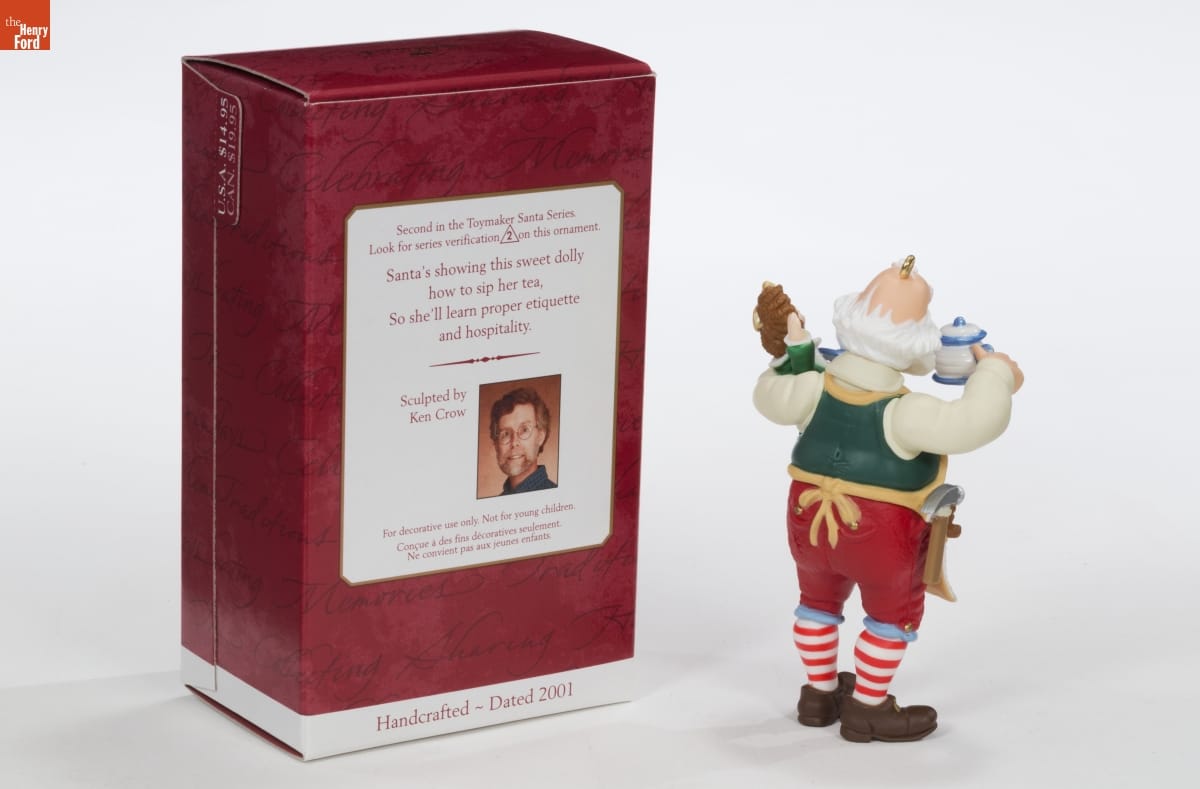 Second in the Toymaker Santa Series. / Look for series verification 2 on this ornament. / Santa's showing this sweet dolly how to sip her tea, So she'll learn proper etiquette and hospitality. / Sculpted by Ken Crow / For decorative use only. Not for young children. / [...] / Handcrafted - Dated 2001