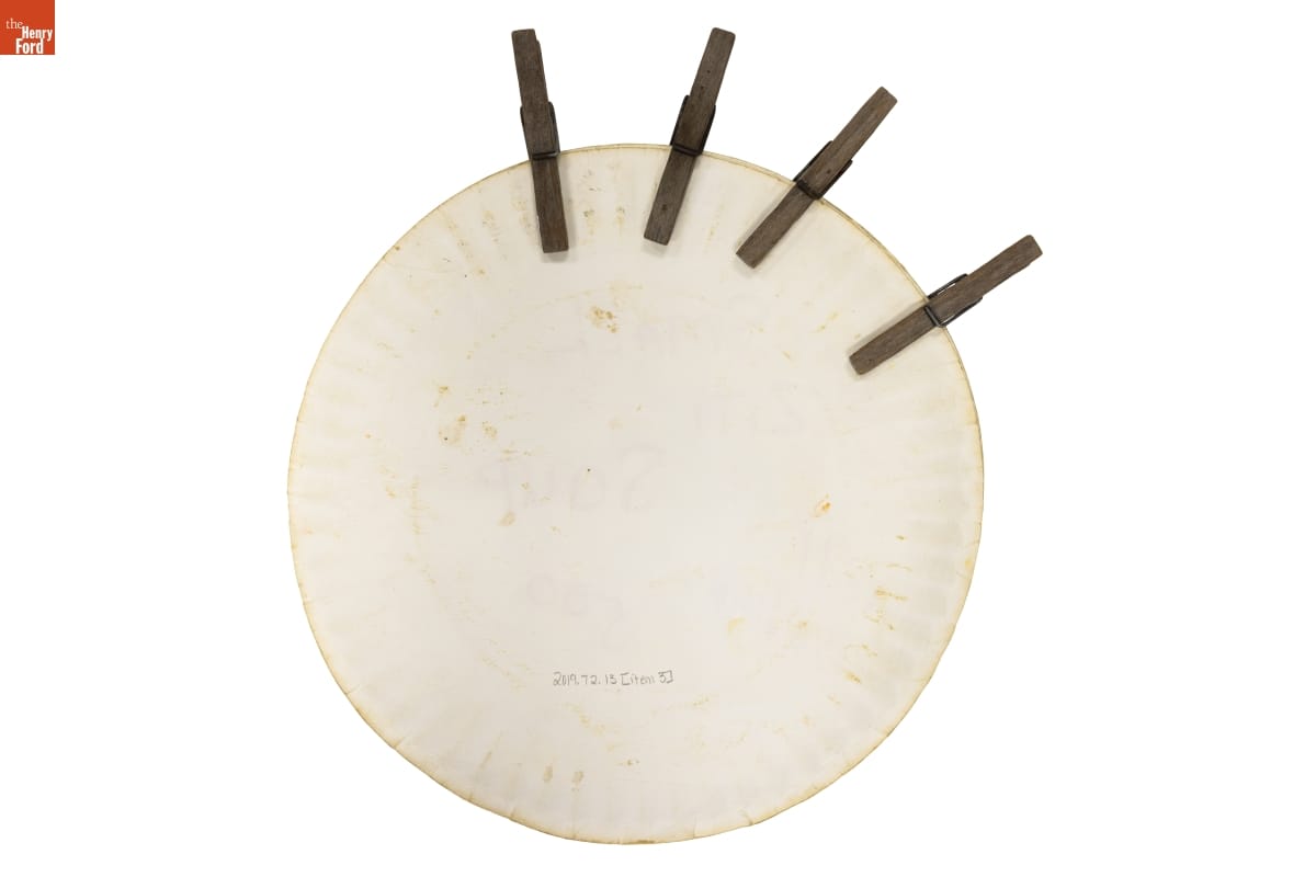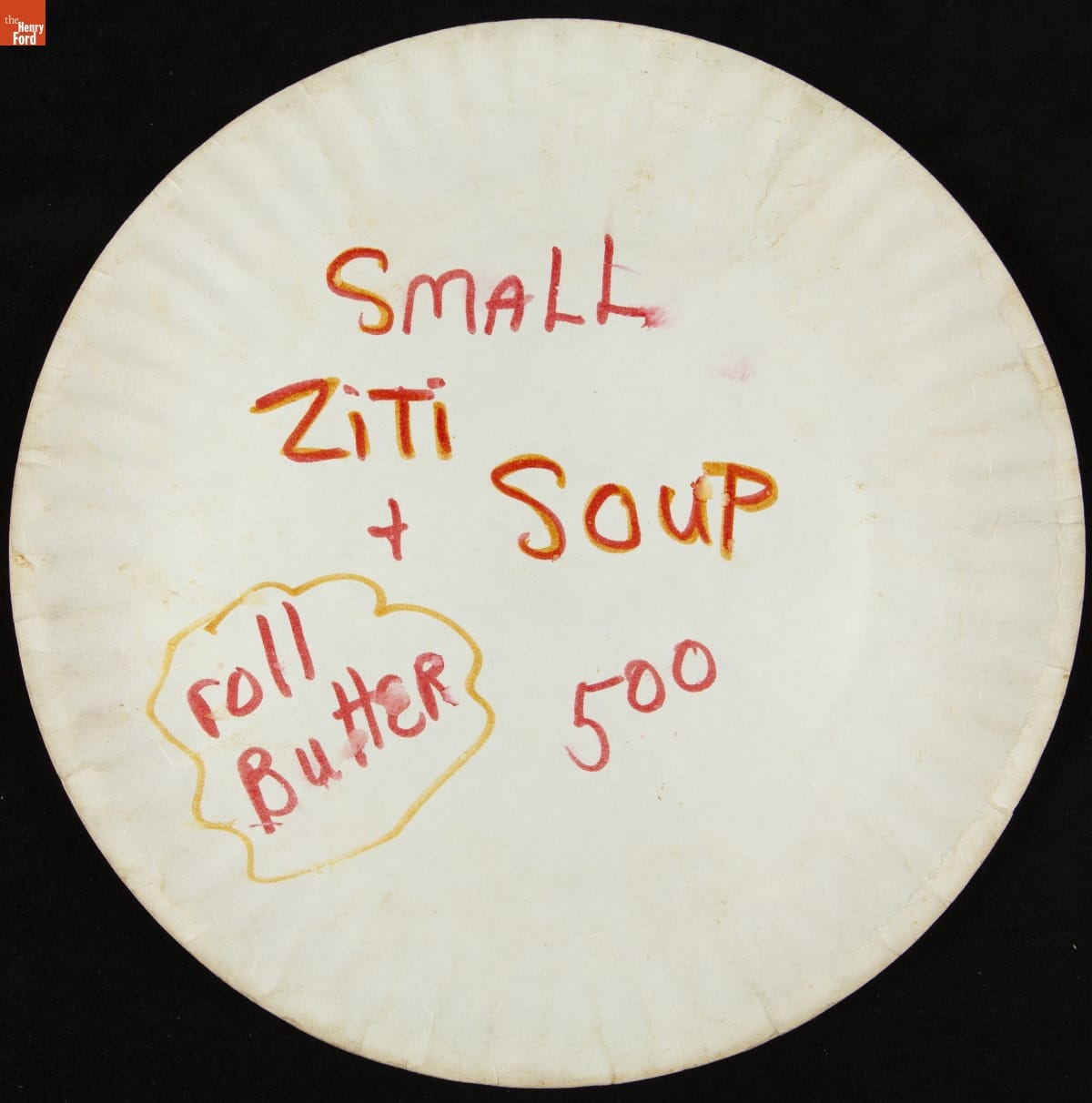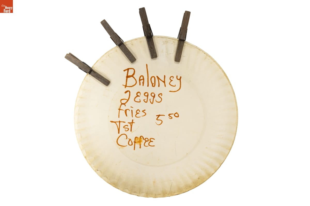 This item comes from the collection of Richard J. S. Gutman, the leading expert on American diners, which was amassed in the course of a thesis, then four books, numerous articles, exhibitions, restorations, and other consulting projects. These handwritten, paper-plate, clothespin-hung menus were a signature trademark of Buddy's Truck Stop (Diner), Somerville, Massachusetts.