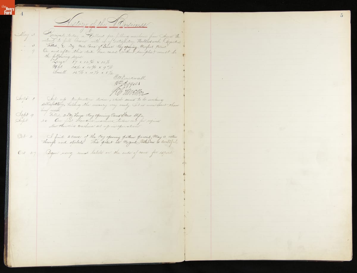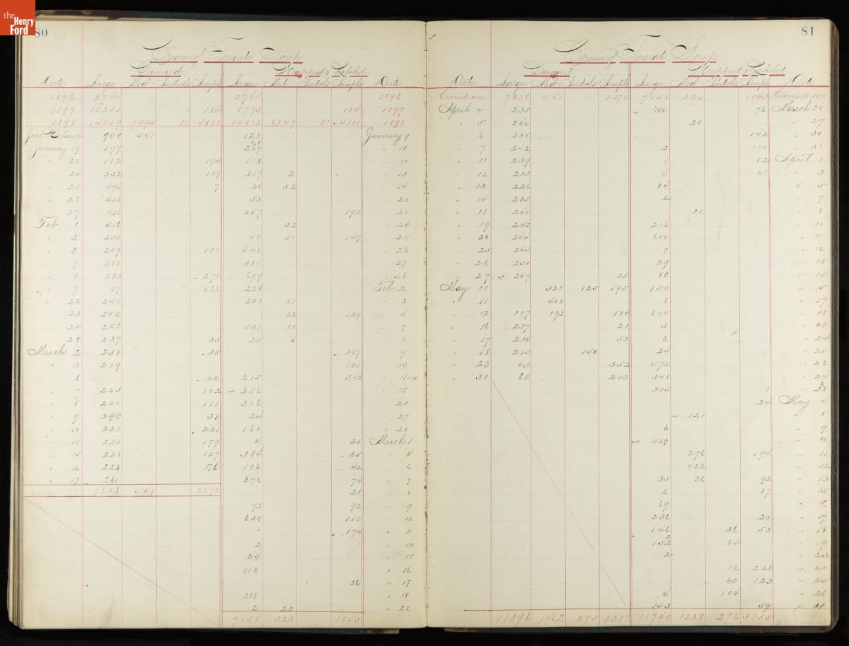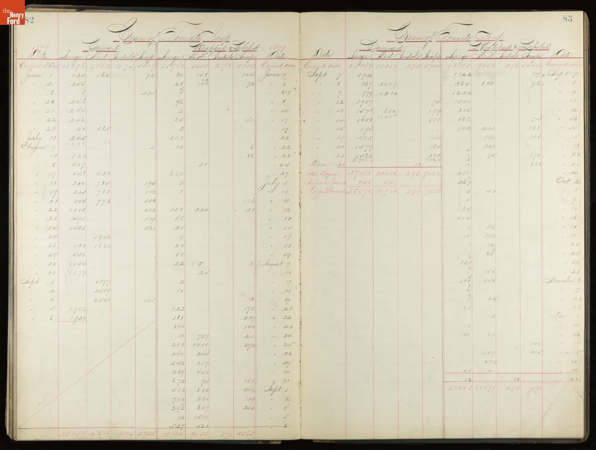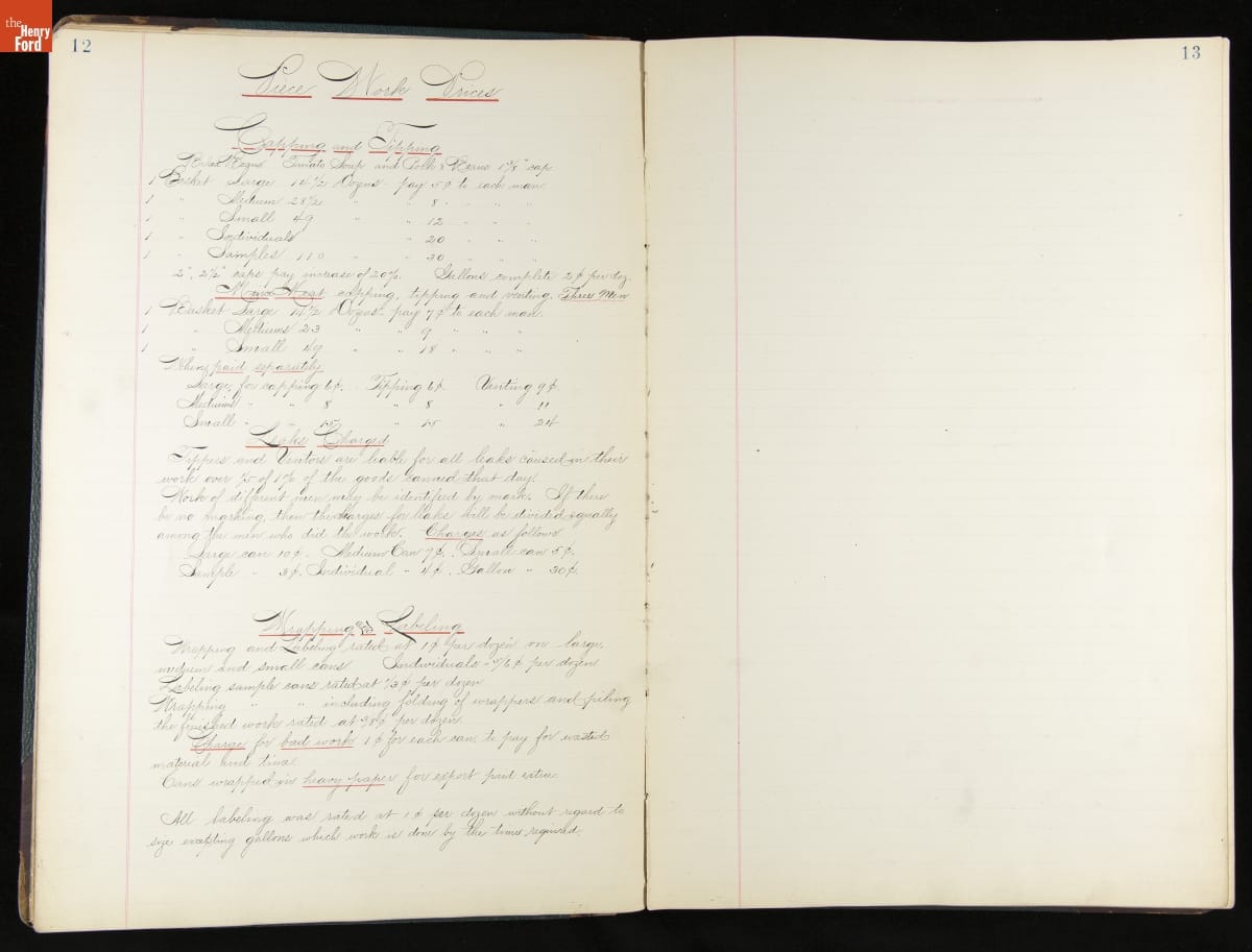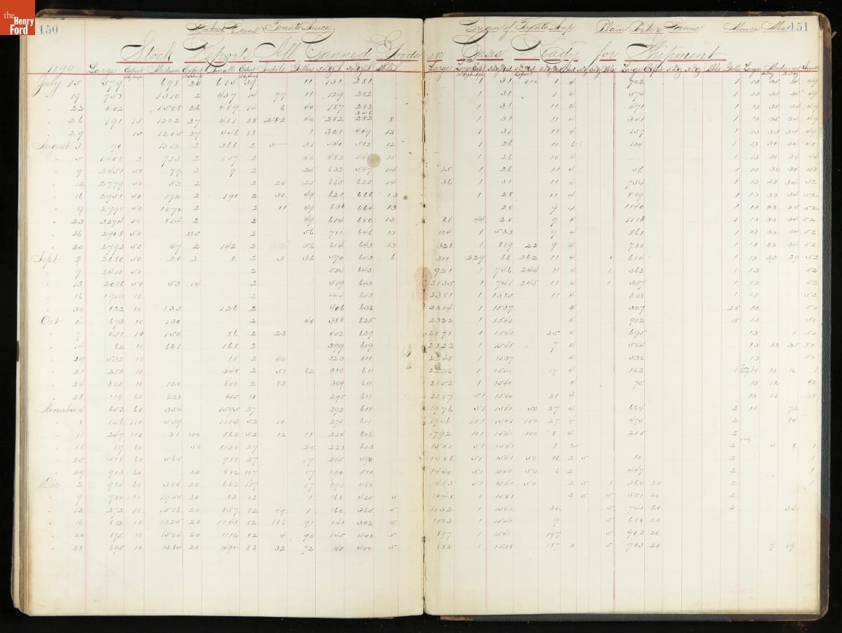 This inventory for the H.J. Heinz Company Canning Department includes a brief history of the department, which canned baked beans, tomato soup, and pork beans, to name a few. Additionally, this book contains a record of the process by the numbers, including the number of cans filled, labeled, and packaged for shipping, and the number of damaged cans per week, among other records.