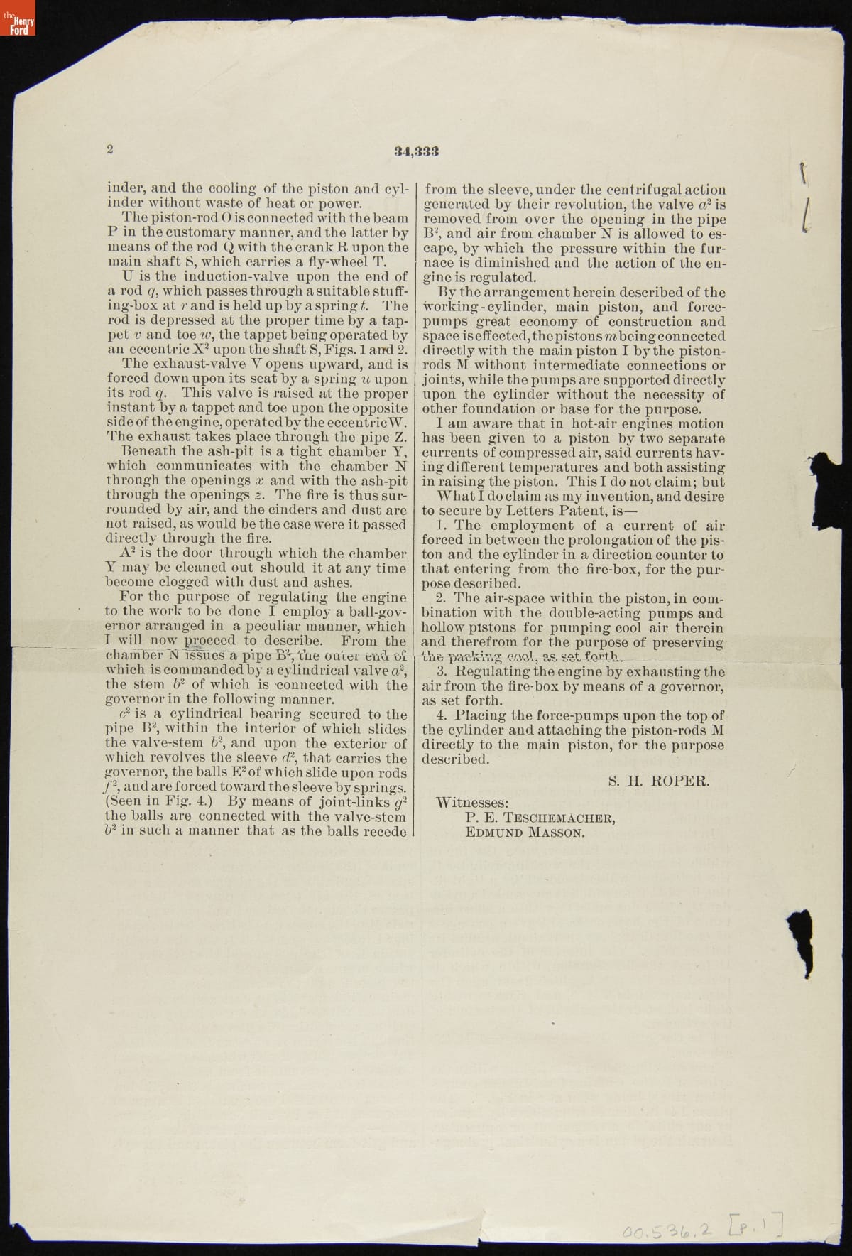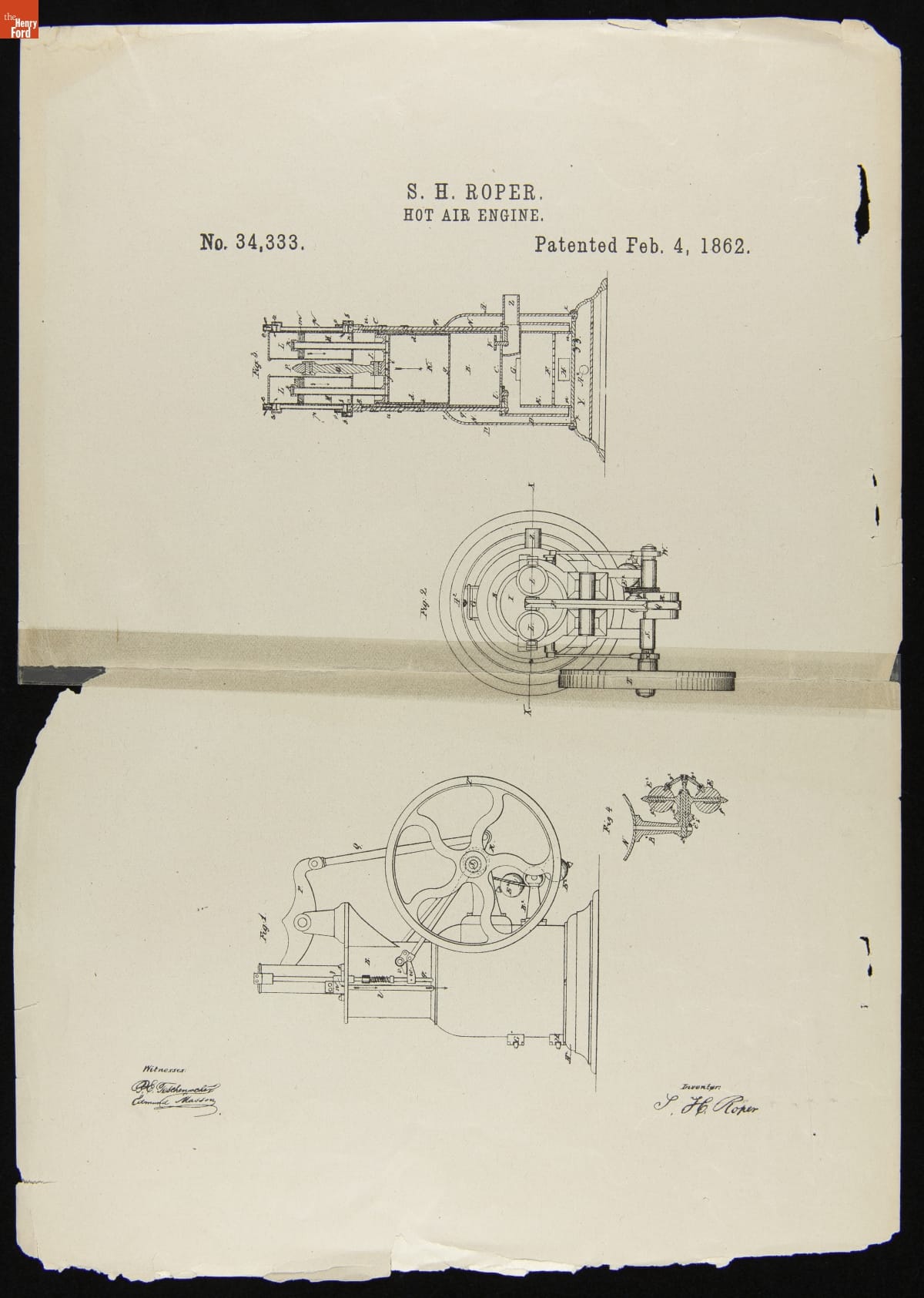 Massachusetts machinist Sylvester Roper patented improvements to a hot air engine that produced motion by harnessing the expansion and contraction of warming and cooling air. This patent covers one of those improvements. Roper also built at least seven steam-powered carriages and two steam-powered motorcycles years before automobiles -- as we know them -- appeared.