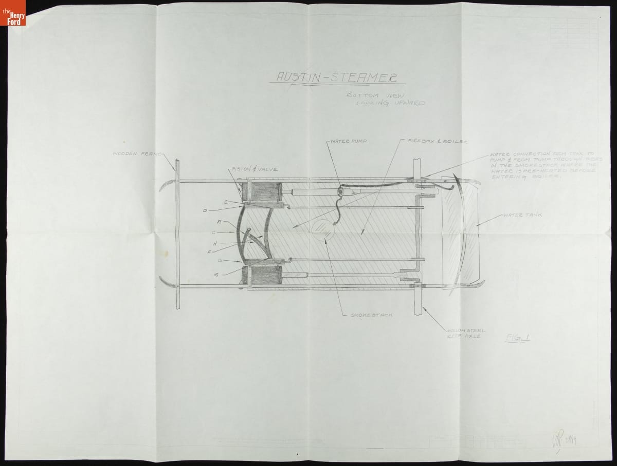 Sylvester Roper's steam-powered carriages anticipated the automobile, though Roper never produced his self-propelled vehicles commercially. This drawing of a Roper Steam Carriage shows two cylinders connected by long rods to a single rear axle. The firebox and boiler are located directly under the operator's seat (not shown). Roper cleverly pre-heated boiler water by circulating it through tubes in the smokestack.