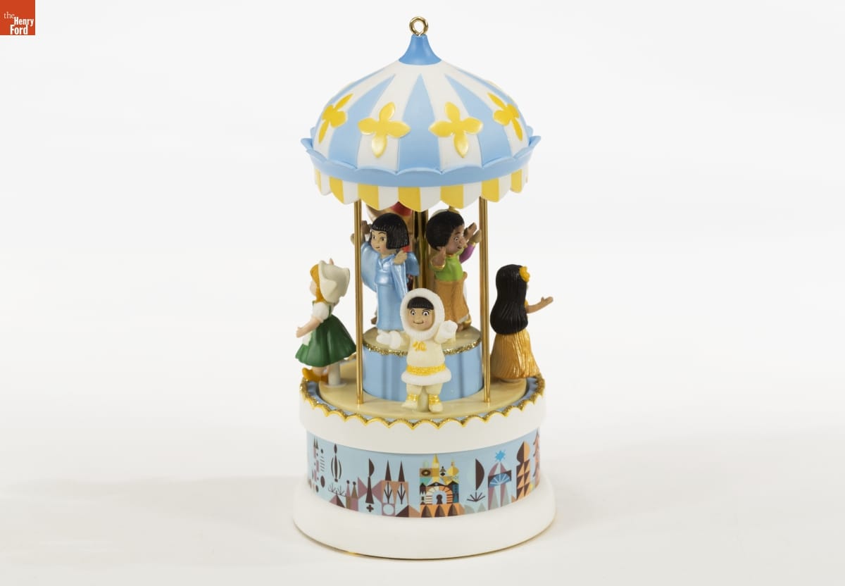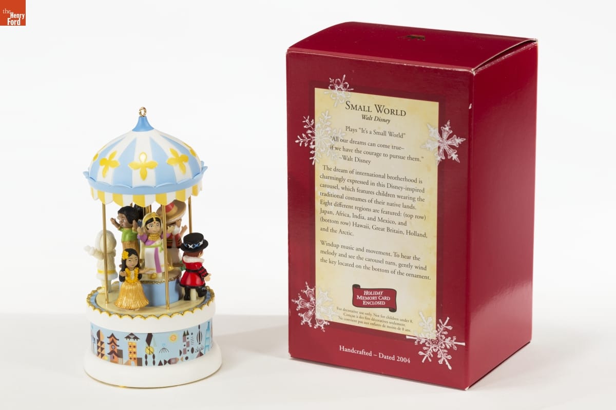 SMALL WORLD / Walt Disney / Plays "It's a Small World" / "All our dreams can come true-if we have the courage to pursue them." - Walt Disney / The dream of international brotherhood is charmingly expressed in this Disney-inspired carousel, which features children wearing the traditional costumes of their native lands. Eight different regions are featured: (top row) Japan, Africa, India, and Mexico, and (bottom row) Hawaii, Great Britain, Holland, and the Arctic. / Windup music and movement. To hear the melody and see the carousel turn, gently wind the key located on the bottom of the ornament. / HOLIDAY / MEMORY CARD / ENCLOSED / For decorative use only. Not for children under 8. / [...] / Handcrafted - Dated 2004