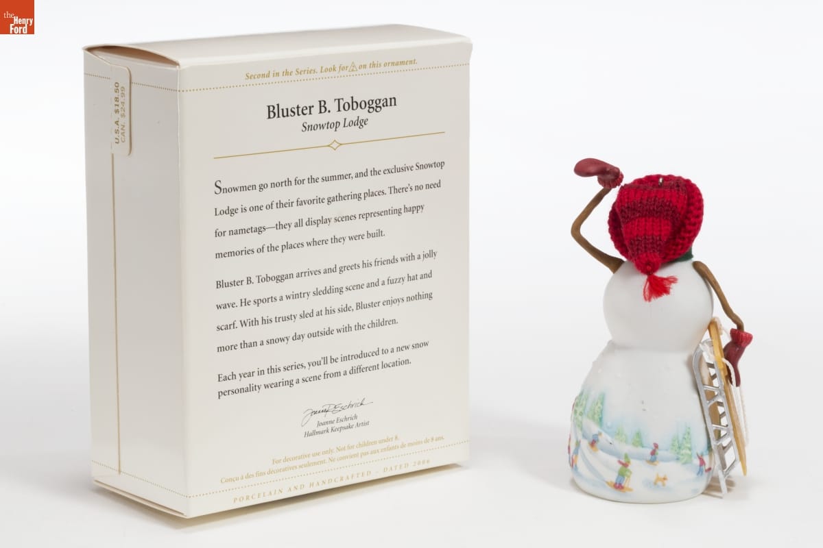 Second in the Series. Look for 2 on this ornament. / Bluster B. Toboggan / Snowtop Lodge / Snowment go north for the summer, and the exclusive Snowtop Lodge is one of their favorite gathering places. There's no need for nametags--they all display scenes representing happy memories of the places where they were built. / Bluster B. Tobaggan arrives and greets his friends with a jolly wave. He sports a wintry sledding scene and a fuzzy hat and scarf. With his trusty sled at his side, Bluster enjoys nothing more than a snowy day outside with the children. / Each year in this series, you'll be introduced to a new snow personality wearing a scene from a different location. / Joanne Eschrich / Hallmark Keepsake Artist / For decorative use only. Not for children under 8. / [...] / PORCELAIN AND HANDCRAFTED - DATED 2006