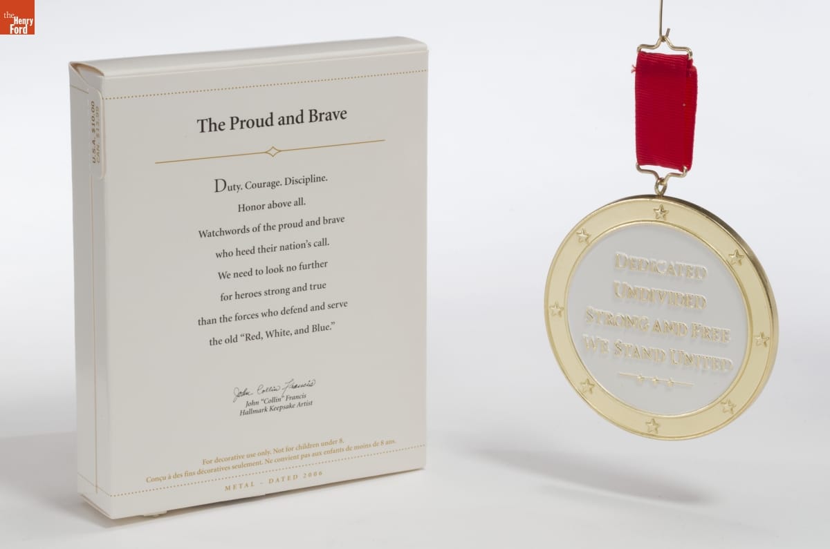 The Proud and Brave / Duty. Courage. Discipline. Honor above all. Watchwords of the proud and brave who heed their nation's call. We need to look no further for heroes strong and true than the forces who defend and serve the old "Red, White, and Blue." / John "Collin" Francis / Hallmark Keepsake Artist / For decorative use only. Not for children under 8. / [...] / METAL - DATED 2006