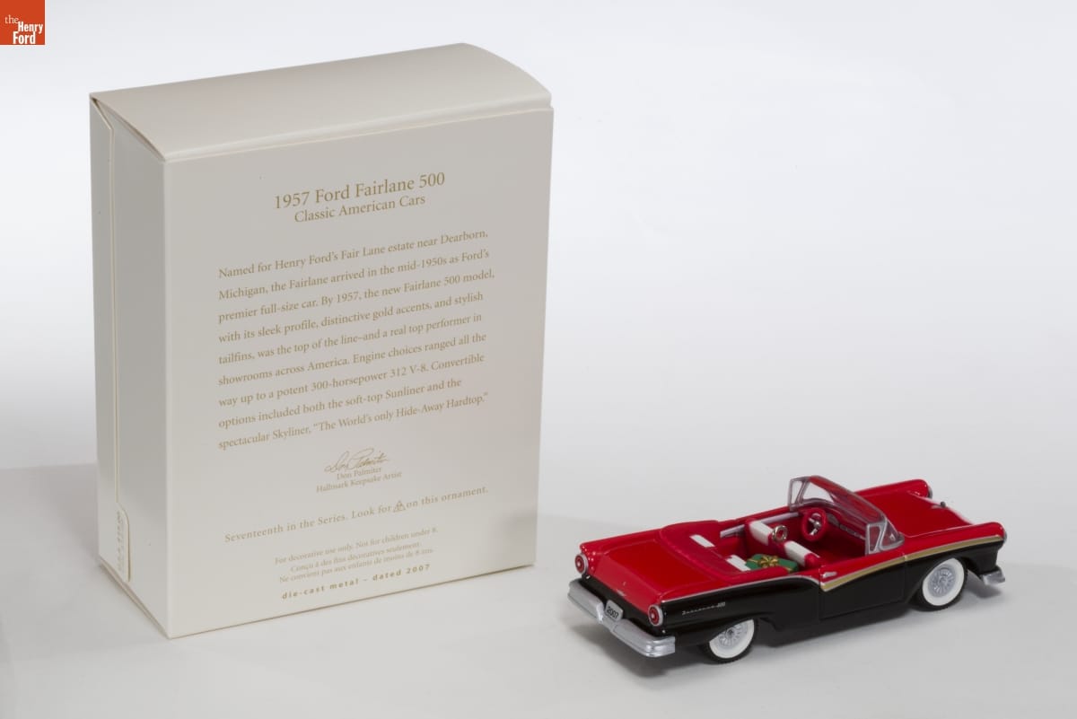 1957 Ford Fairlane 500 / Classic American Cars / Named for Henry Ford's Fair Lane estate near Dearborn, Michigan, the Fairlane arrived in the mid-1950s as Ford's premier full-size car. By 1957, the new Fairlane 500 model, with its sleek profile, distinctive gold accents, and stylish tailfins, was the top of the line-and a real top performer in showrooms across America. Engine choices ranged all the way up to a potent 300-horsepower 312 V-8. Convertible options included both the soft-top Sunliners and the spectacular Skyliner, "The World's only Hide-Away Hardtop." / Don Palmiter / Hallmark Keepsake Artist / Seventeenth in the Series. Look for 17 on this ornament. / For decorative use only. Not for children under 8. / [...] / die-cast metal - dated 2006