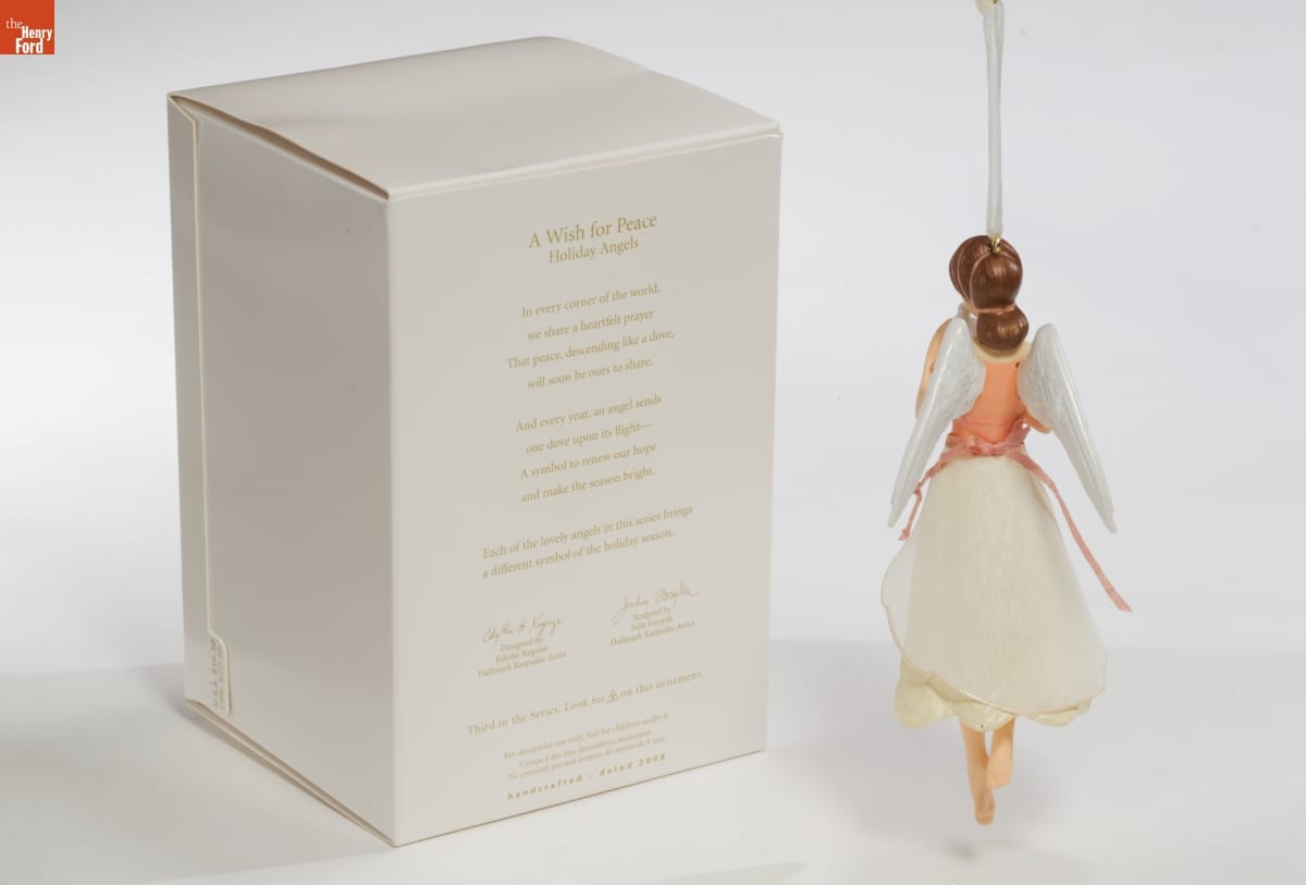 A Wish for Peace / Holiday Angels / In every corner of the world, we share a heartfelt prayer That peace, descending like a dove, will soon be ours to share. And every year, an angel sends one dove upon its flight--A symbol to renew our hope and make the season bright. / Each of the lovely angels in this series brings a different symbol of the holiday season. / Designed by Edythe Kegrize / Hallmark Keepsake Artist / Sculpted by Julie Forsyth / Hallmark Keepsake Artist / Third in the Series. Look for 3 on this ornament. / For decorative use only. Not for children under 8. / [...] / handcrafted - dated 2008