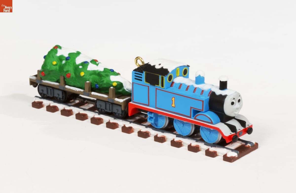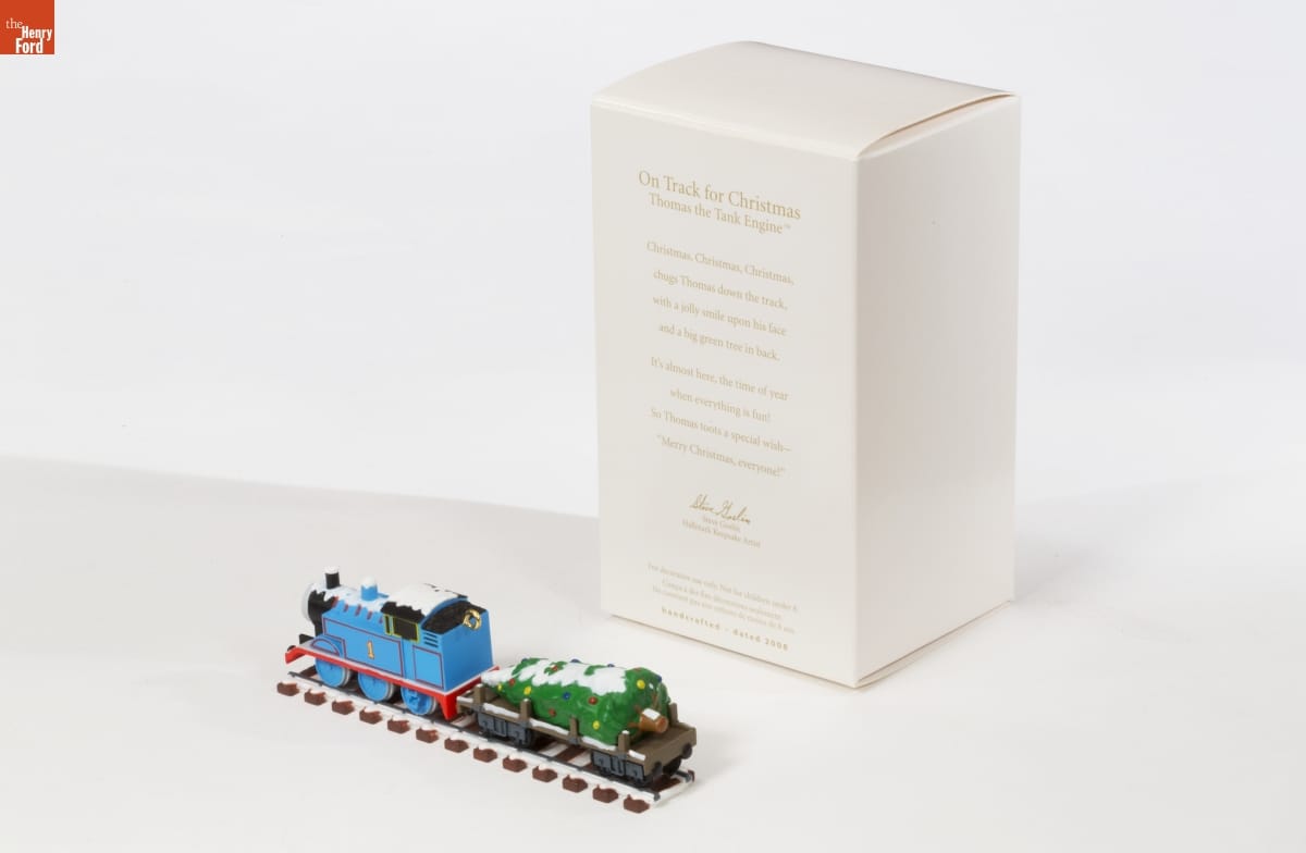 On Track for Christmas / Thomas the Tank Engine / Christmas, Christmas, Christmas, chugs Thomas down the track, with a jolly smile upon his face and a big green tree in back. / It's almost here, the time of year when everything is fun! So Thomas toots a special wish--"Merry Christmas, everyone!" / Steve Goslin / Hallmark Keepsake Artist / For decorative use only. Not for children under 8. / [...] / handcrafted - dated 2008