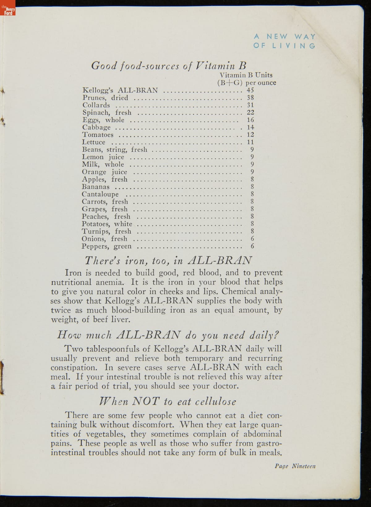 After inventing flaked corn with his brother, W.K. Kellogg entered the cereal business in 1906 with his first cereal, Kellogg's Corn Flakes. As the Kellogg Company's product line expanded, it was committed to offering healthful breakfast cereals. Kellogg's All-Bran, introduced in 1916, was featured in this recipe booklet, which offers recipes using the cereal and informs readers of the health benefits of eating bran.