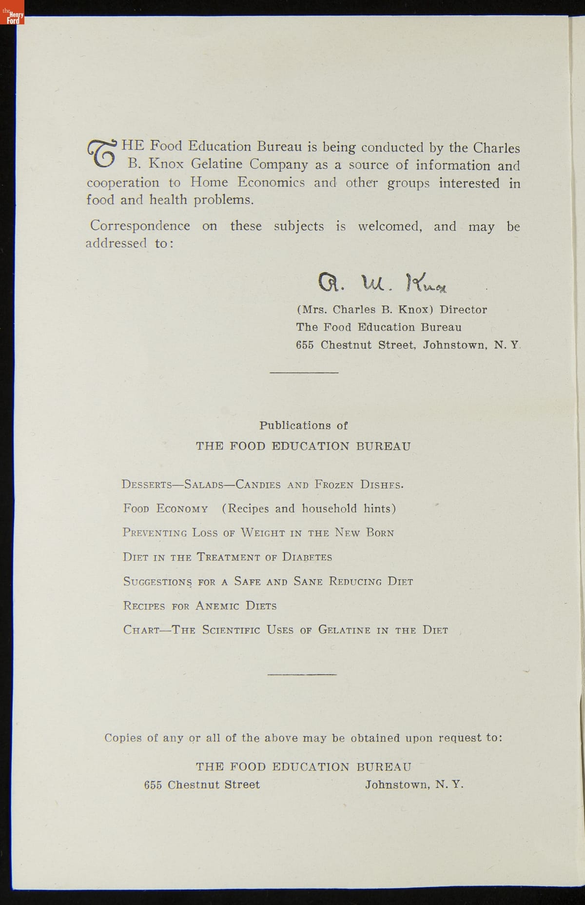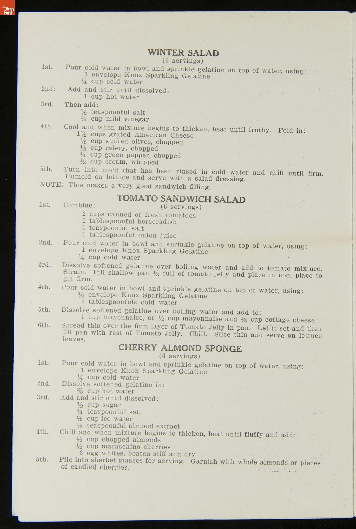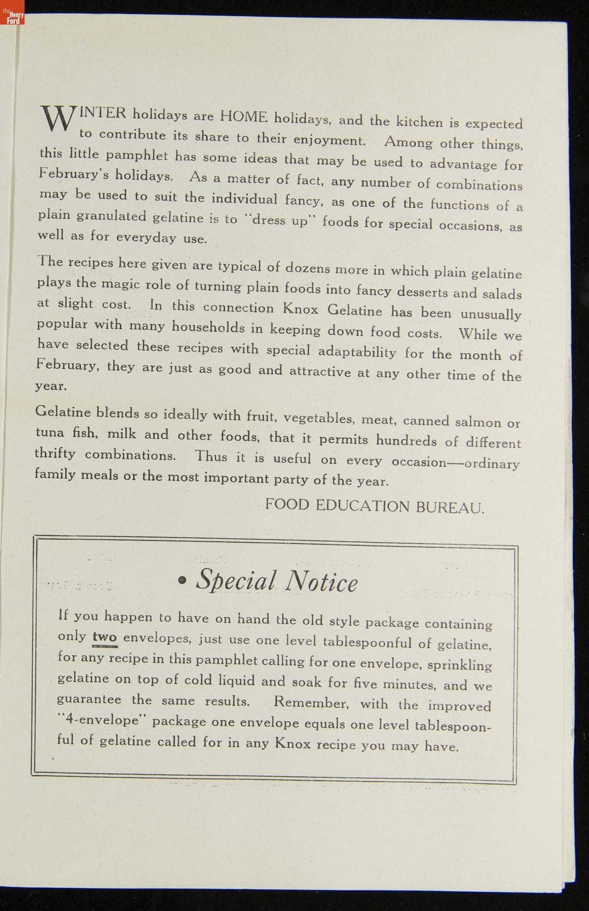 Recipe Booklet, "Knox Gelatine Co. Special Dishes for February," circa 1935