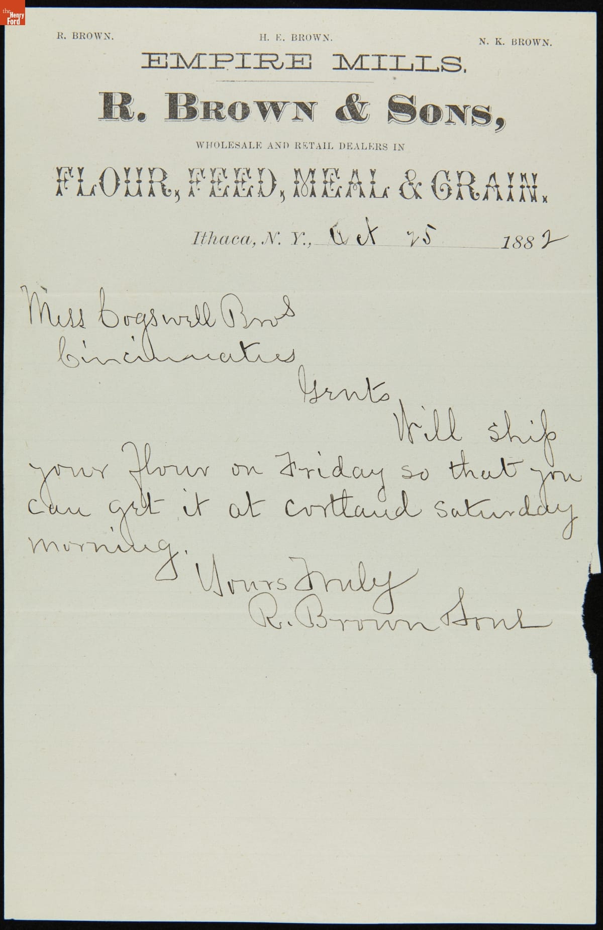 [printed:] R. Brown & Sons / WHOLESALE AND RETAIL DEALERS IN / FLOUR, FEED, MEAL & GRAIN / ITHACA, N.U. / [written:] Mess. Cogswell Bros / Cincinnatus [NY] / Gents / Will ship your flour on Friday so that you can get it at Cortland Saturday morning. / Yours Truly / R. Brown & Sons /