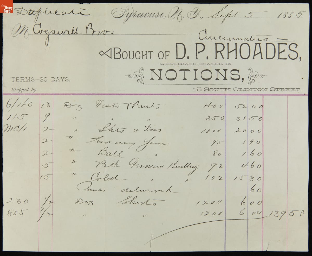 Invoice for Purchase of Notions by Cogswell Brothers from D. P. Rhoades, September 5, 1885