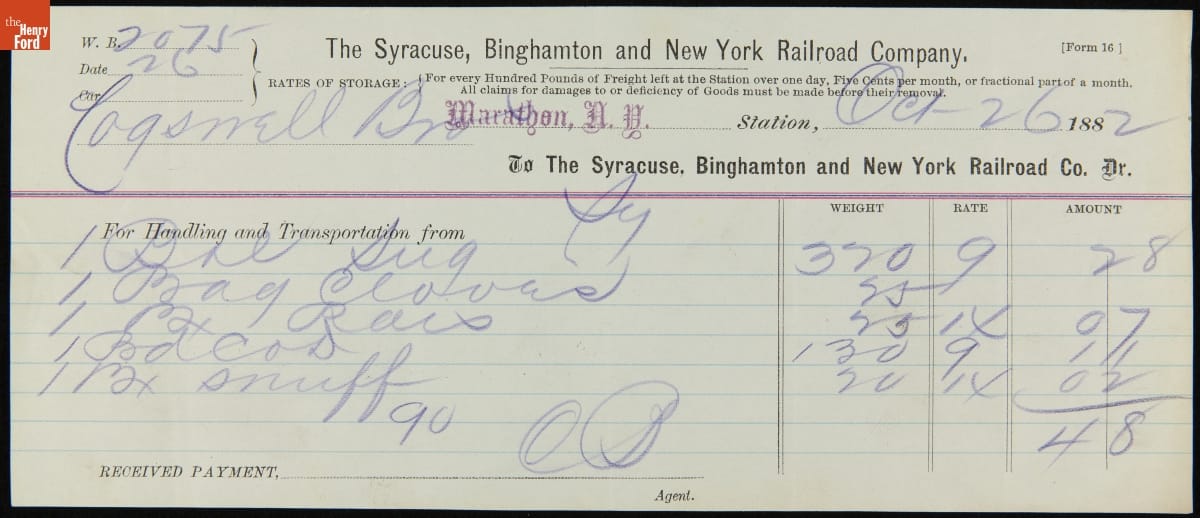 Freight Bill for Cogswell Brothers' Rail Shipment, October 26, 1882