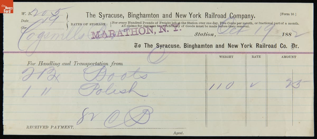 Freight Bill for Cogswell Brothers' Rail Shipment, October 19, 1882