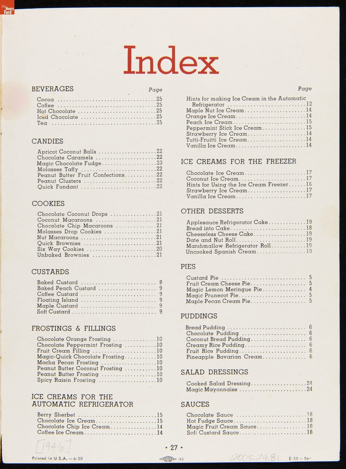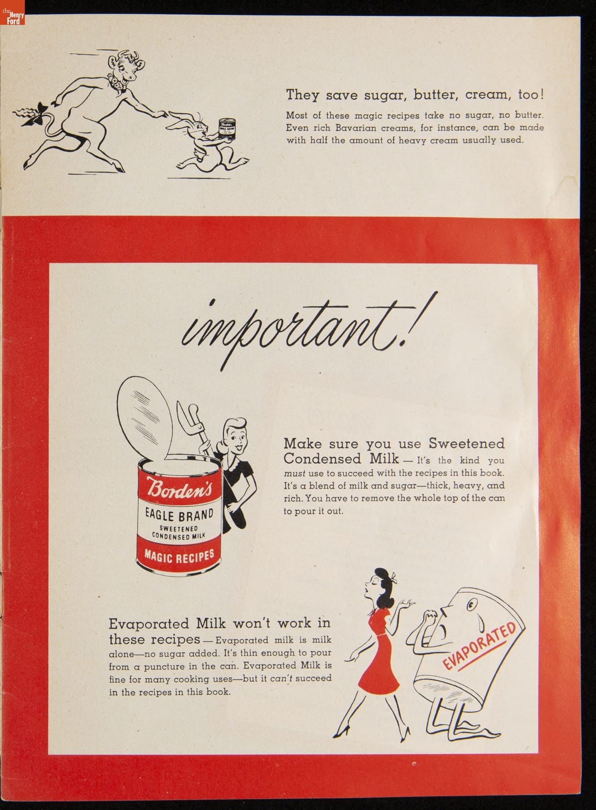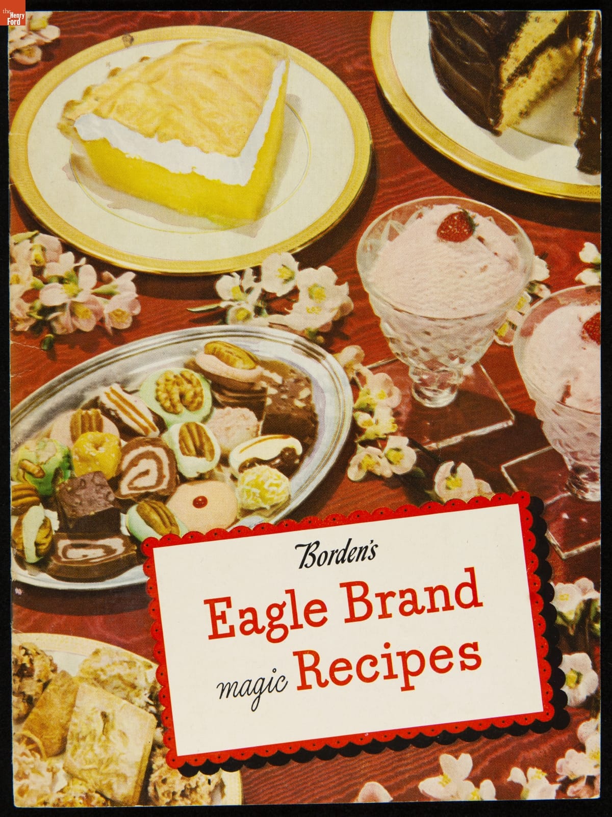 Before the invention of pasteurized milk, fresh milk was often unsafe to drink, as it soured quickly. After experimenting with ways to preserve milk, Gail Borden introduced Eagle Brand Sweetened Condensed Milk in 1856. What was advertised as nourishment for young children soon gained popularity as a baking and cooking ingredient. This booklet from 1946 features recipes using Borden's Eagle Brand Condensed Milk.