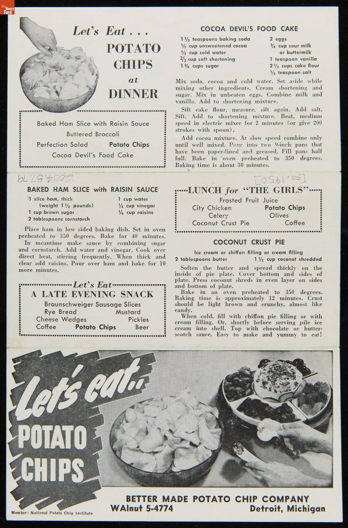 Recipe Leaflet, "Better Made Potato Chip Company: Let's Eat ... Potato Chips," circa 1950