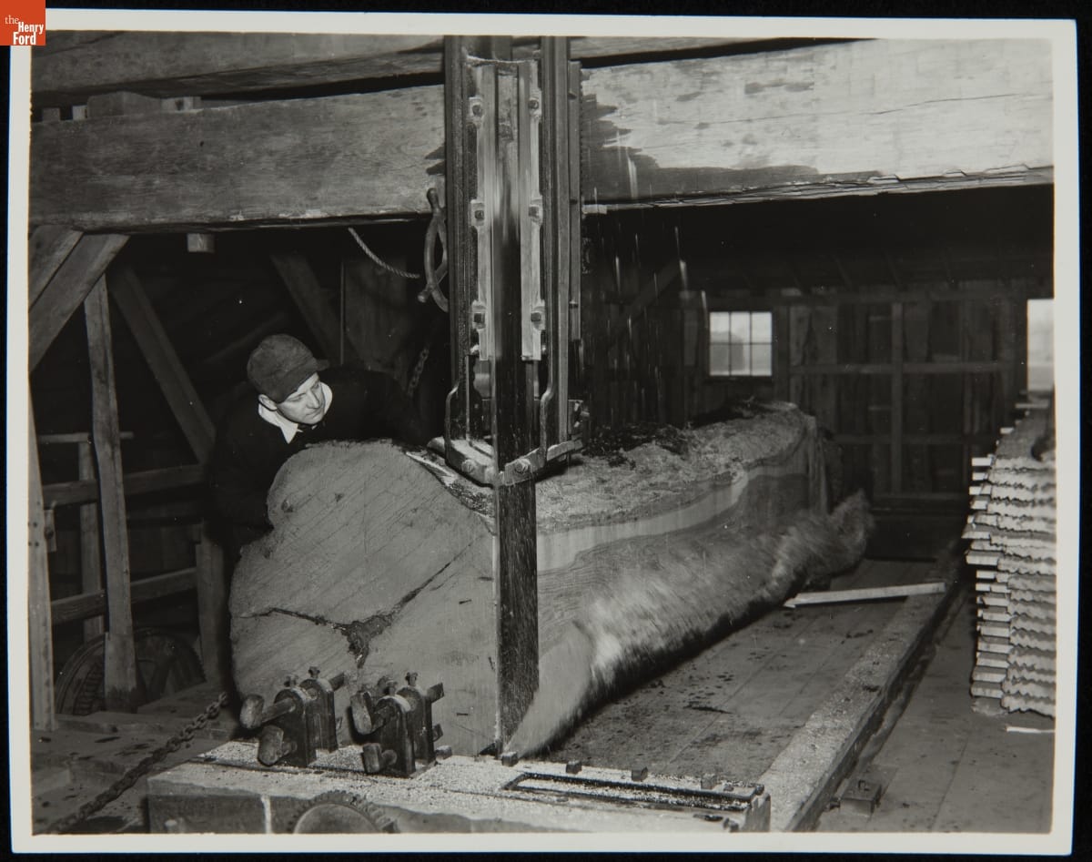 A Man Using a Saw inside the Tripp Sawmill in Greenfield Village, 1932-1940