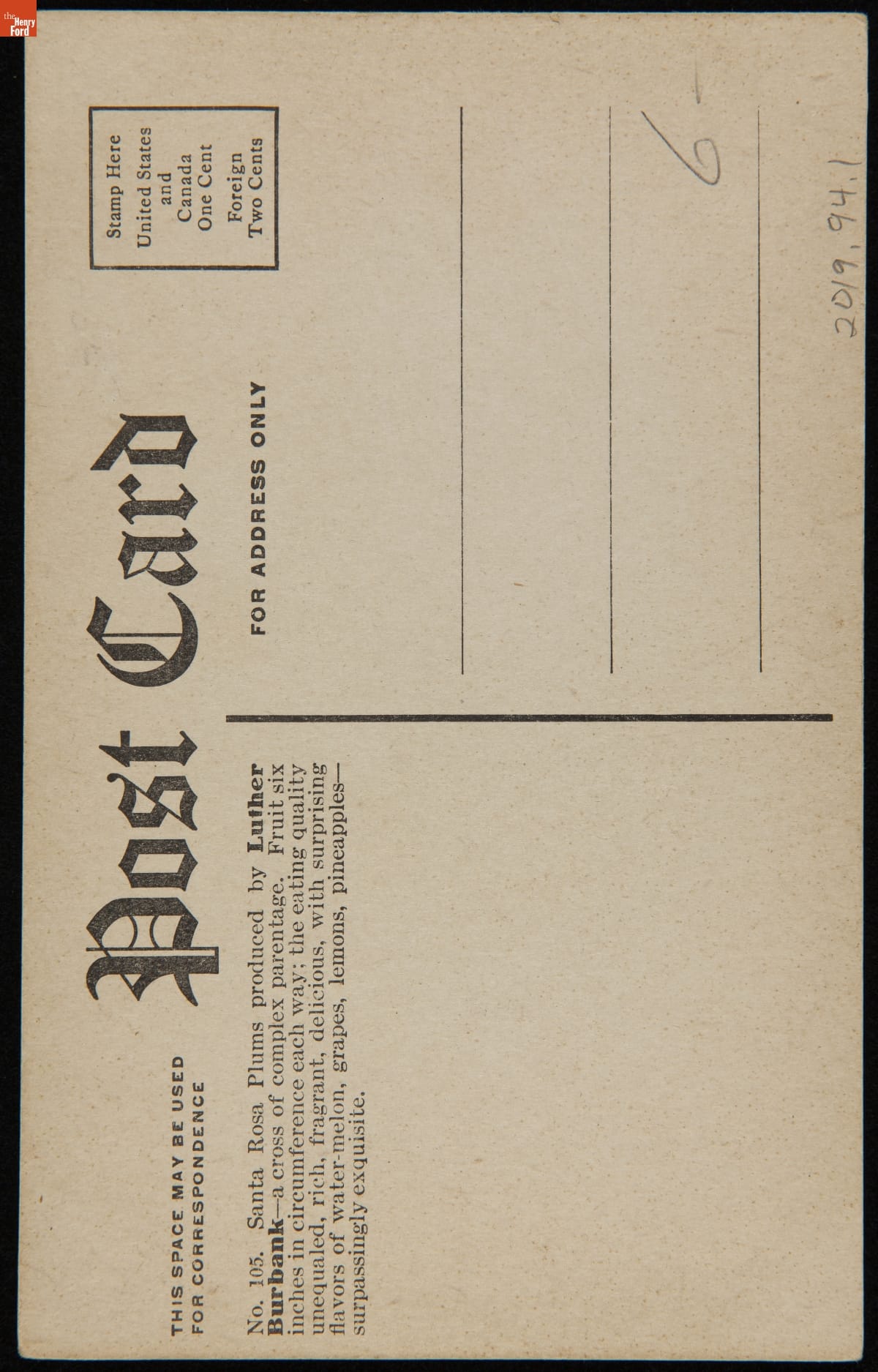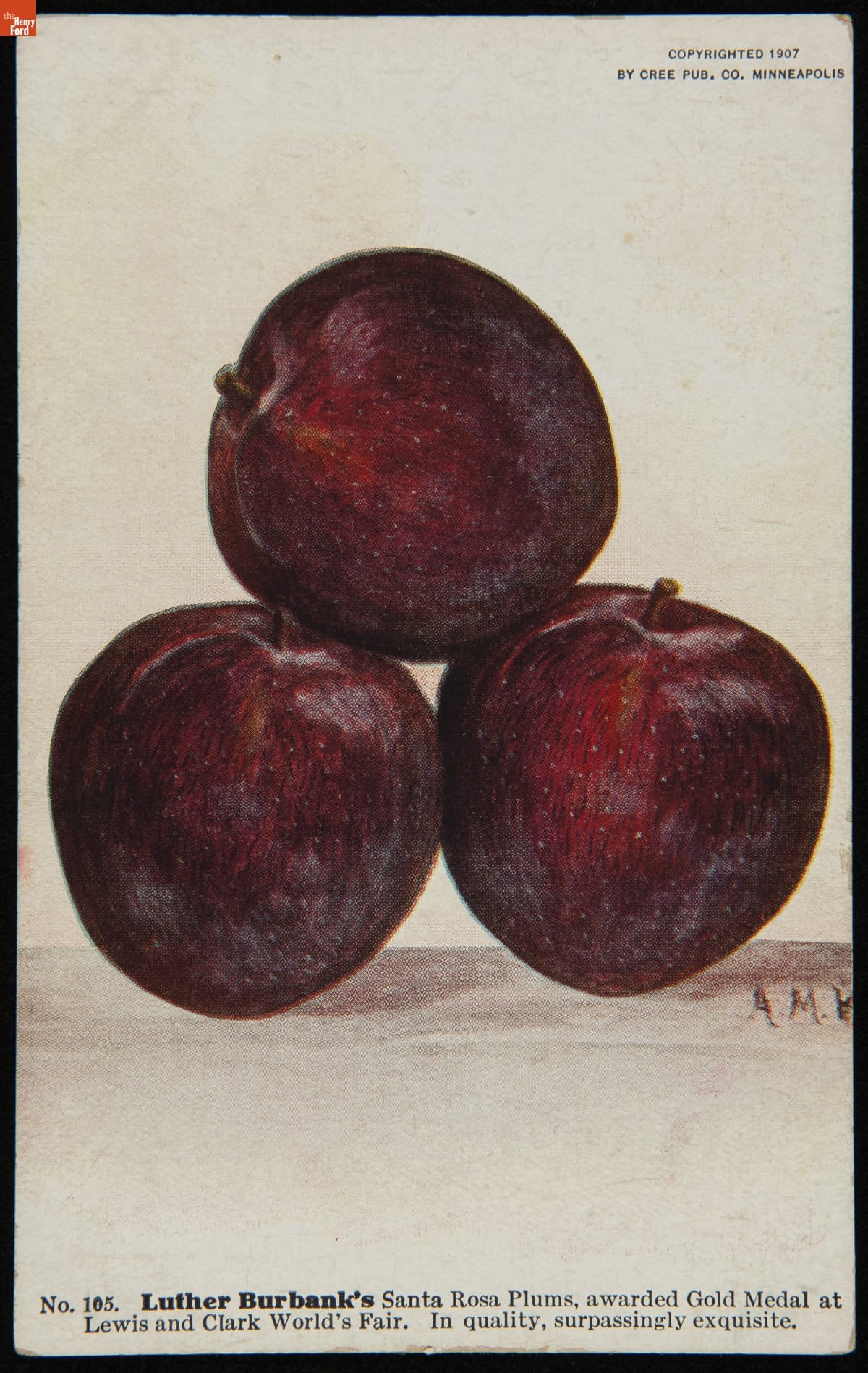 No. 105. Luther Burbank's Santa Rosa Plums, awarded Gold Medal at Lewis and Clark World's Fair. In quality, surprisingly exquisite.