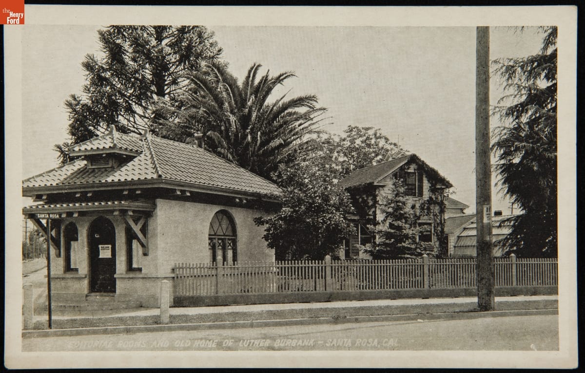 Luther Burbank (1849-1926), an American horticulturalist and author, gained a reputation for selective breeding that yielded more than 800 new fruits, vegetables, flowers, and other plants. He opened this Bureau of Information in 1910 to sell seeds and souvenirs. The Luther Burbank Society, organized in 1910, used Burbank's old home as an editorial office and the Bureau for storage of their multi-volume series on Burbank, published in 1913-1914.