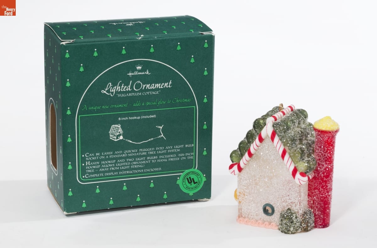 Hallmark / Lighted Ornament / "SUGARPLUM COTTAGE" / A unique new ornament - addes a special glow to Christmas! / 6-inch hookup (included) / CAN BE EASILY AND QUICKLY PLUGGED INTO ANY LIGHT BULB SOCKET ON A STANDARD MINIATURE TREE LIGHT SYSTEM. / HANDY HOOKUP AND TWO LIGHT BULBS INCLUDED. (SIX-INCH HOOKUP ALLOWS LIGHTED ORNAMENT TO HANG FREELY ON THE TREE - AWAY FROM LIGHT STRING) / COMPLETE DISPLAY INSTRUCTIONS ENCLOSED.