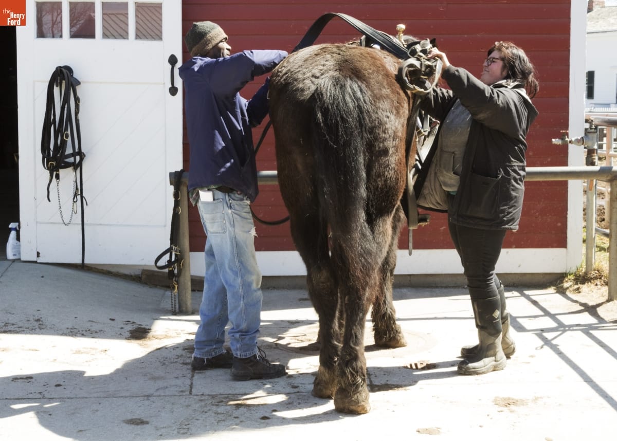 Melvin Parson, Spring 2019 Entrepreneur-In-Residence at The Henry Ford, gained experience harnessing draft horses with guidance from the William Ford Barn staff, thanks to the William Davidson Foundation's Initiative for Entrepreneurship. Parson, founder of We The People Growers Association and a market gardener, learned about the importance of draft horses in traditional agricultural practices during his residency.