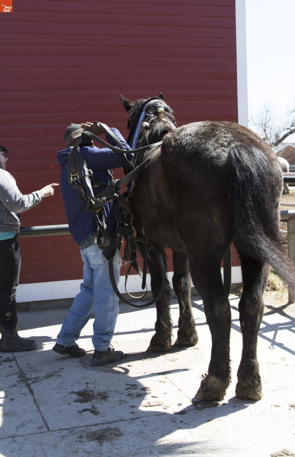 Melvin Parson, Spring 2019 Entrepreneur-In-Residence at The Henry Ford, gained experience harnessing draft horses with guidance from the William Ford Barn staff, thanks to the William Davidson Foundation's Initiative for Entrepreneurship. Parson, founder of We The People Growers Association and a market gardener, learned about the importance of draft horses in traditional agricultural practices during his residency.