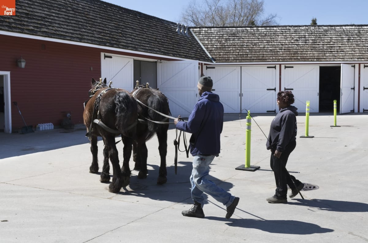 Melvin Parson, Spring 2019 Entrepreneur-In-Residence at The Henry Ford, tried his hand at line-drive draft horses at Greenfield Village's William Ford Barn, thanks to the William Davidson Foundation's Initiative for Entrepreneurship. Parson, founder of We The People Growers Association, learned about harnessing, hitching, and driving draft horses, an essential ingredient in quintessential organic agriculture.