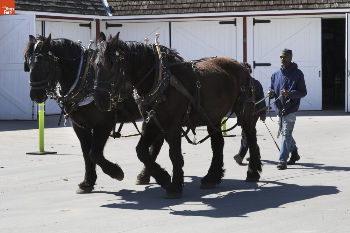 Melvin Parson, Spring 2019 Entrepreneur-In-Residence at The Henry Ford, tried his hand at line-drive draft horses at Greenfield Village's William Ford Barn, thanks to the William Davidson Foundation's Initiative for Entrepreneurship. Parson, founder of We The People Growers Association, learned about harnessing, hitching, and driving draft horses, an essential ingredient in quintessential organic agriculture.