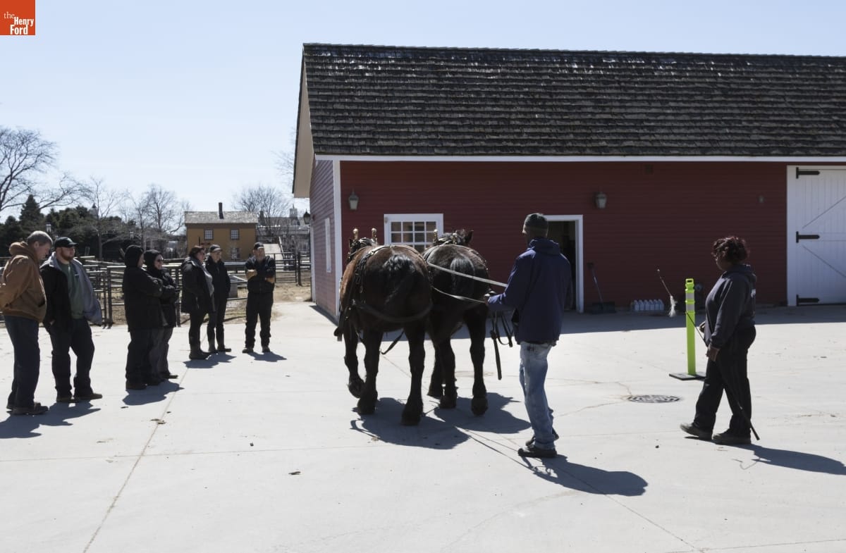 Melvin Parson, Spring 2019 Entrepreneur-In-Residence at The Henry Ford, tried his hand at line-drive draft horses at Greenfield Village's William Ford Barn, thanks to the William Davidson Foundation's Initiative for Entrepreneurship. Parson, founder of We The People Growers Association, learned about harnessing, hitching, and driving draft horses, an essential ingredient in quintessential organic agriculture.