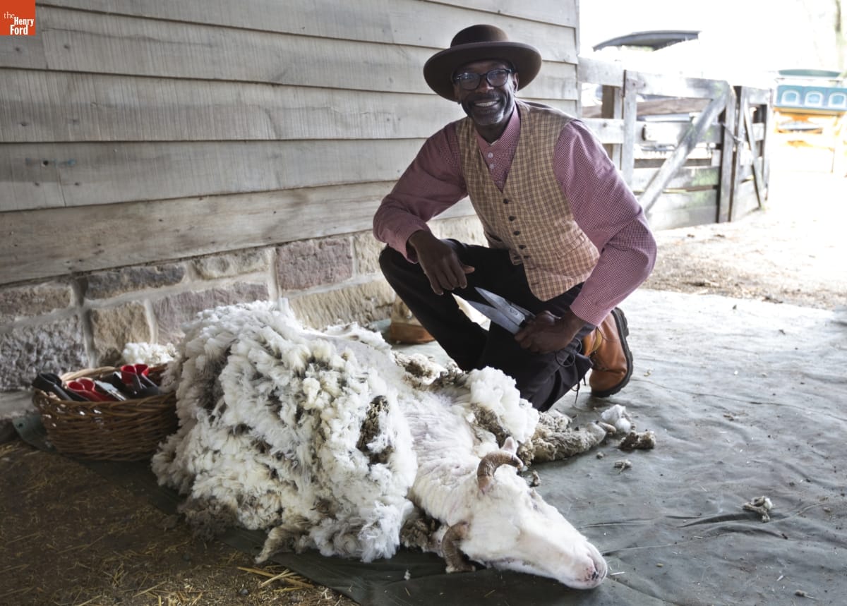 Melvin Parson, Spring 2019 Entrepreneur-In-Residence at The Henry Ford, hand-sheared a Merino sheep with guidance from the Firestone Farm staff, thanks to the William Davidson Foundation's Initiative for Entrepreneurship. Parson, founder of We The People Growers Association, learned about sheep as wool producers during the 1880s on Harvey Firestone's family farm near Columbiana County, Ohio.