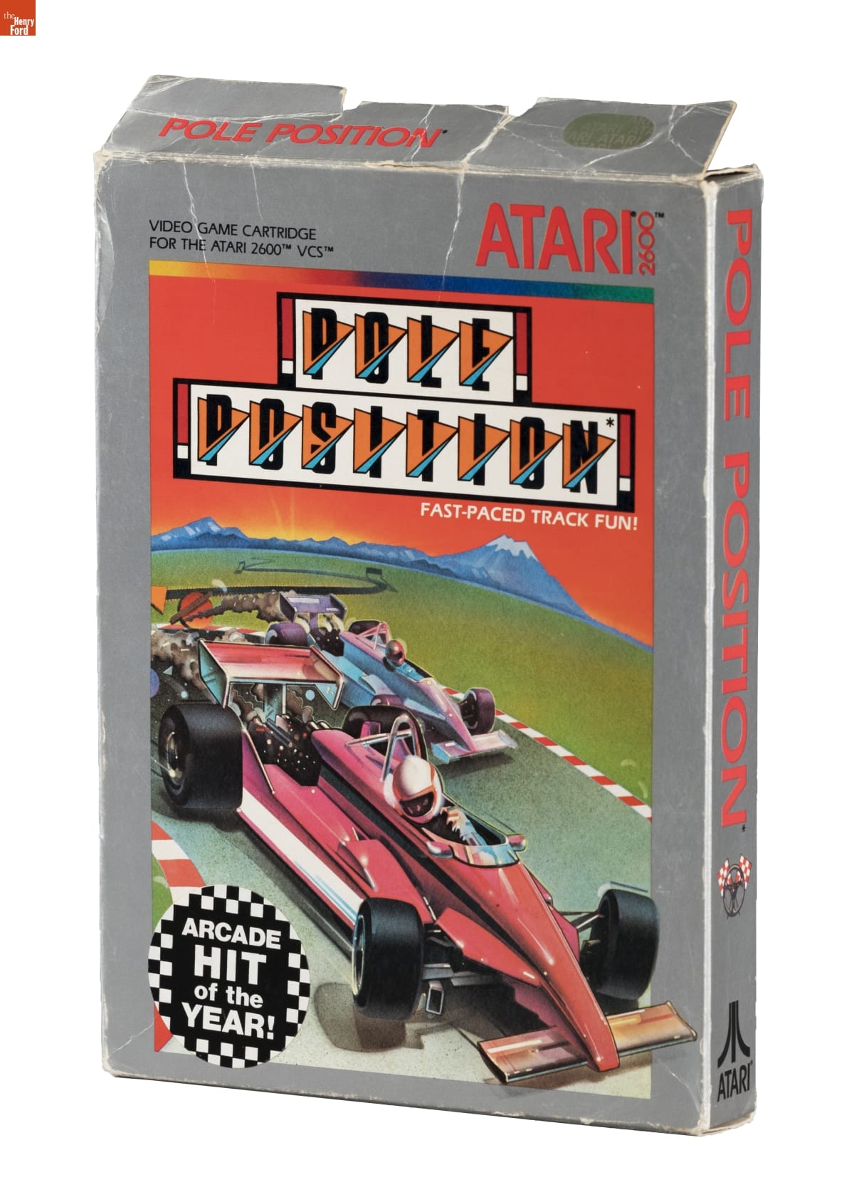 on front of game cartridge: VIDEO GAME CARTRIDGE / ATARI (R) 2600 VCS ATARI 2600 / POLE POSITION / FAST-PACED TRACK FUN! / USE WITH JOYSTICK CONTROLLER / (C) 1983 ATARI, INC. ALL RIGHTS RESERVED 2694 / *POLE POSITION is engineered and designed by Namco ltd., manufactured under license by Atari, Inc. / Trademark and (C) Namco 1982 on top of game cartridge: POLE POSITION on front of packaging: VIDEO GAME CARTRIDGE / FOR THE ATARI 2600 VCS ATARI 2600 / POLE POSITION / FAST-PACED TRACK FUN! / ARCADE HIT of the YEAR! on sides of packaging: POLE POSITION ATARI on back of packaging: POLE POSITION / "...literally blows the doors off any driving game you've ever experienced. - Joystik magazine, April '83. / FOR USE WITH THE ATARI 2000 SERIES SYSTEMS, AND THE SEARS VIDEO ARCADE AND VIDEO ARCADE II SYSTEMS. / ONE PLAYER / Use your Joystick Controller with this Game Program / For use with North American and other NTSC television sets only. / MODEL 2694 / Qualify for the Grand Prix and win the Pole Position, the number one starting spot. Then go flat out to beat the track record and finish a winner. Features treacherous curves, hair-raising near misses, and all the thrills of the popular video arcade game. / ATARI / A Warner Communications Company / ATARI, INC., Consumer Division / [...] . (C) 1983 ATARI, Inc. ALL RIGHTS RESERVED. MADE IN U.S.A. / [...]