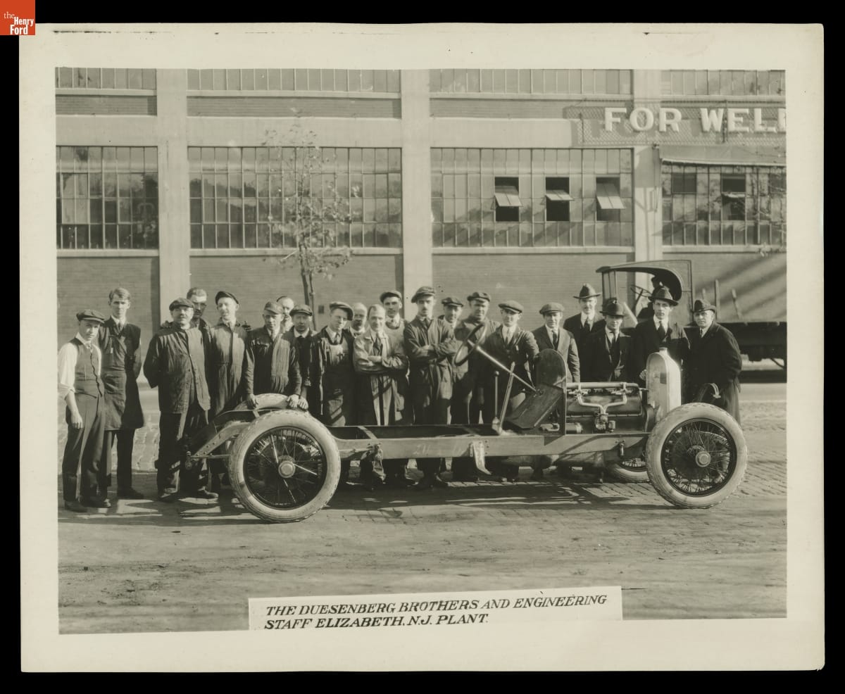 Fred and Augie Duesenberg with Engineering Staff outside Duesenberg Plant in Elizabeth, New Jersey, 1920-1928