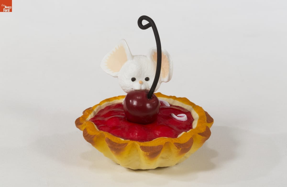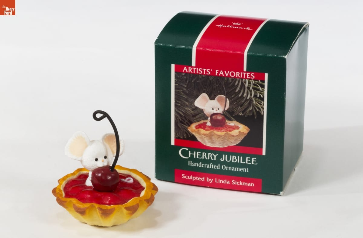 KEEPSAKE ORNAMENT / Sculptor Linda Sickman has given the little white mouse in "Cherry Jubilee" quite a treat. "I like the size relationship between the cherry and the mouse," she says. "Like many of us at Christmas, this mouse has eyes that are bigger than his stomach!" / "Cherry Jubilee" is included in a group of ornaments called Artists' Favorites. These ornaments feature designs reflecting the personal interests of the artists who create them. Look for Linda's initials on this design.