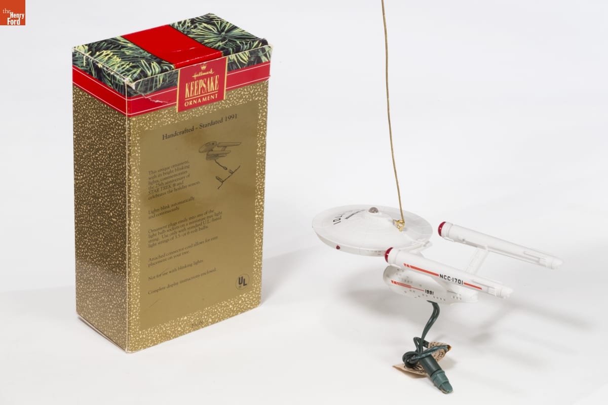 on top of ornament: U.S.S. ENTERPRISE / NCC-1701 on front of packaging: MAGIC / BLINKING / LIGHTS! / Hallmark / KEEPSAKE / ORNAMENT / STAR TREK / 1991 / 25th ANNIVERSARY/ Saucer / Lights Blink / Starship Enterprise on back of packaging: Hallmark / KEEPSAKE / ORNAMENT / Handcrafted - Stardated 1991 / This unique ornament, with its bright blinking lights, commemorates the 25th anniversary of STAR TREK and celebrates the holiday season. / Lights blink automatically and continually. / Ornament plugs easily into any of the light bulb sockets on a miniature tree light string. Use only with standard U.L.-listed light strings of 3.5-or 6-volt bulbs. / Attached connector cord allows for easy placement on your tree. / Not for use with blinking lights. / Complete display instructions enclosed. / $20.00 on bottom of packaging: (C) 1991 Paramount Pictures. All Rights Reserved. / STAR TREK is a Registered Trademark of Paramount Pictures. / Mfd. for Hallmark Cards, Inc., Authorized User. K.C., MO 64141 / Ornament Made and Assembled in China / Connector Cord Made in Taiwan / Connector Cord U.S. Pat. No. 4,544,218 / Circuitry U.S. Pat. No. 4,682,079 / QLX719-9