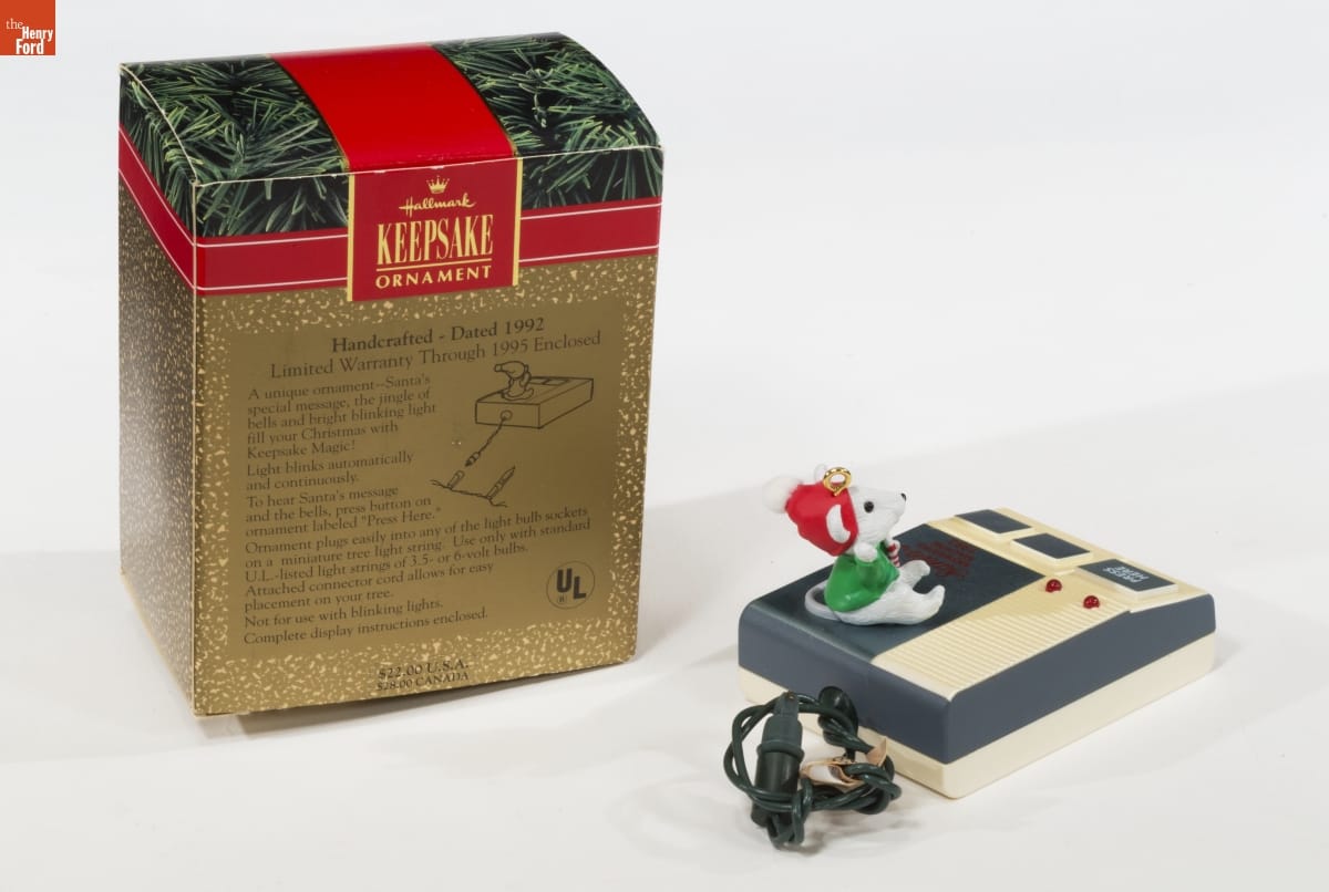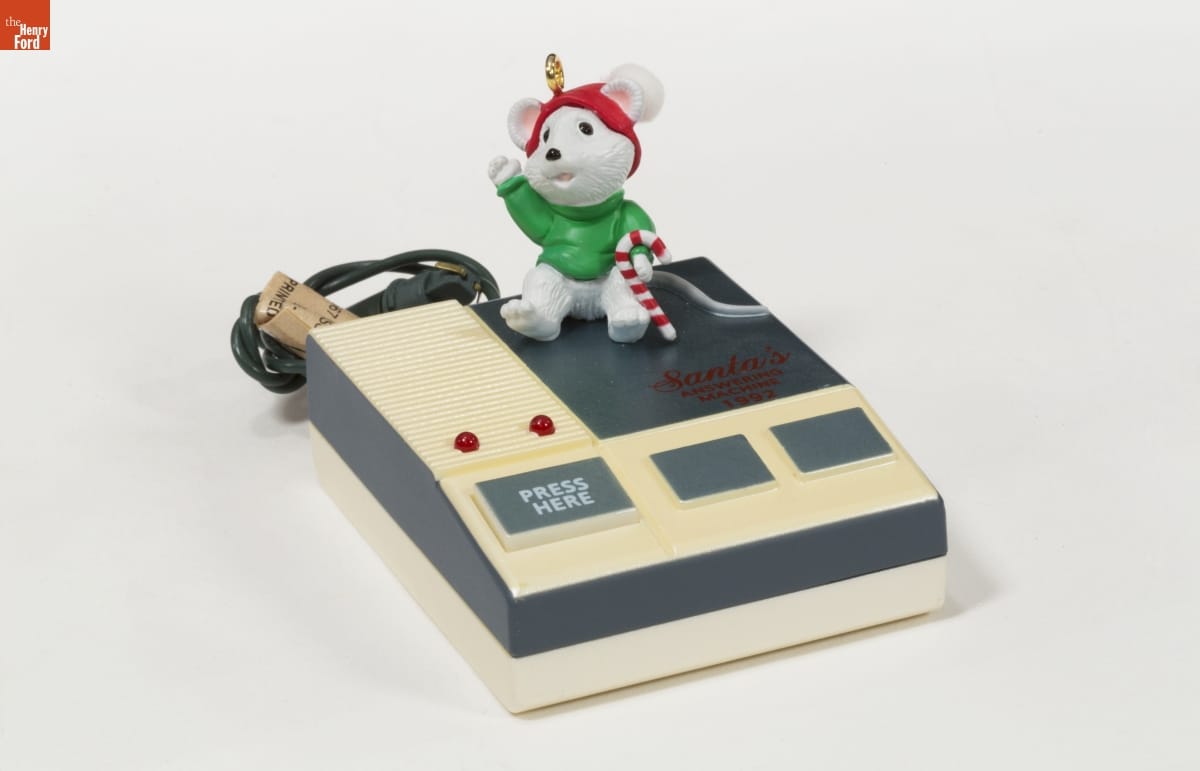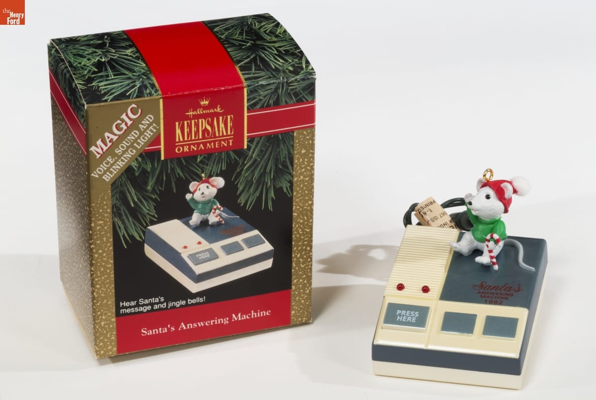 In 1992, answering machines linked to landline phones let callers leave taped voice messages to friends, family, and loved ones. This Hallmark ornament plays a holiday message from Santa when you press the button.