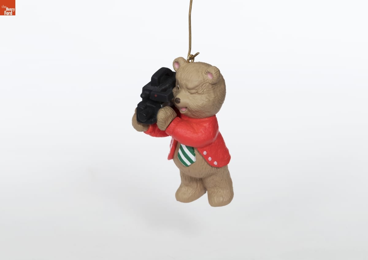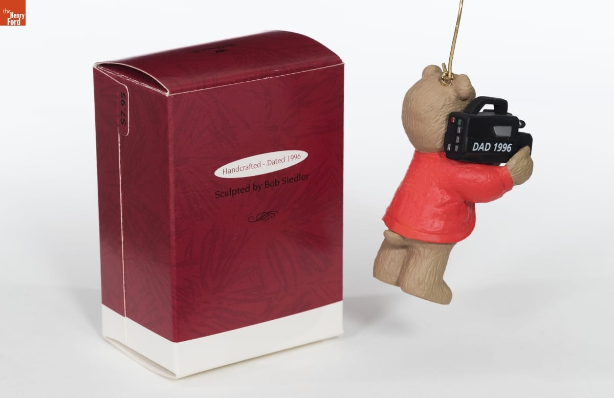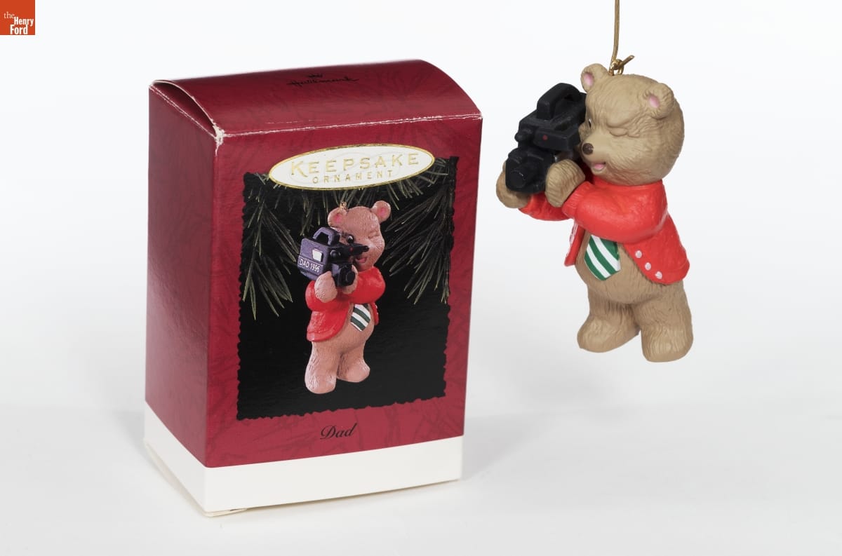 This Hallmark ornament depicts Dad as a videotaping Teddy Bear with coat and tie. The heavy video camera he is balancing on his shoulders was an iconic piece of technology of the era. This would have made the perfect gift for the proud Dad who insisted on capturing his child's antics and milestones on videotape, despite the weight of the camera.