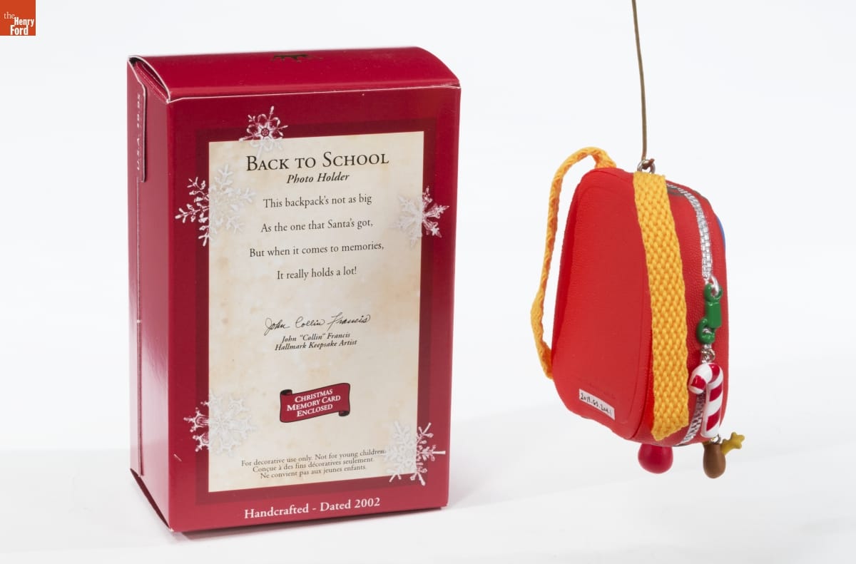 BACK TO SCHOOL / Photo Holder / This backpack's not as big As the one that Santa's got, But when it comes to memories. It really holds a lot! / John "Collin" Francis / Hallmark Keepsake Artist / CHRISTMAS / MEMORY CARD / ENCLOSED / For decorative use only. Not for young children. / [...] / Handcrafted - Dated 2002