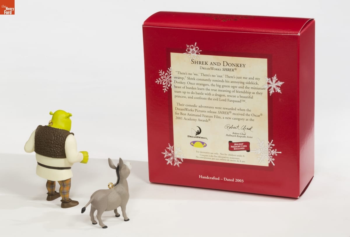 SHREK AND DONKEY / DREAMWORKS SHREK / "There's no 'we.' There's no 'our.' There's just me and my swamp,: Shrek constantly reminds his annoying sidekick, Donkey. Once strangers, the big green ogre and the miniature beast of burden learn the true meaning of friendship as they team up to do battle with a dragon, resuce a beautiful princess, and confront the evil Lord Farquad. / Their comedic adventures were rewarded when the DreamWorks Pictures release SHREK received the Oscar for Best Animated Feature Firm, a new category at the 2001 Academy Awards. / Robert Chad / Hallmark Keepsake Artist / DREAMWORKS / HOLIDAY / MEMORY CARD / ENCLOSED / For decorative use only. Not for children under 8. / [...] / Handcrafted - Dated 2003