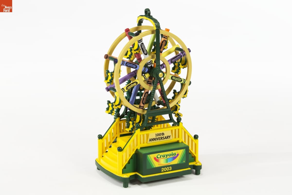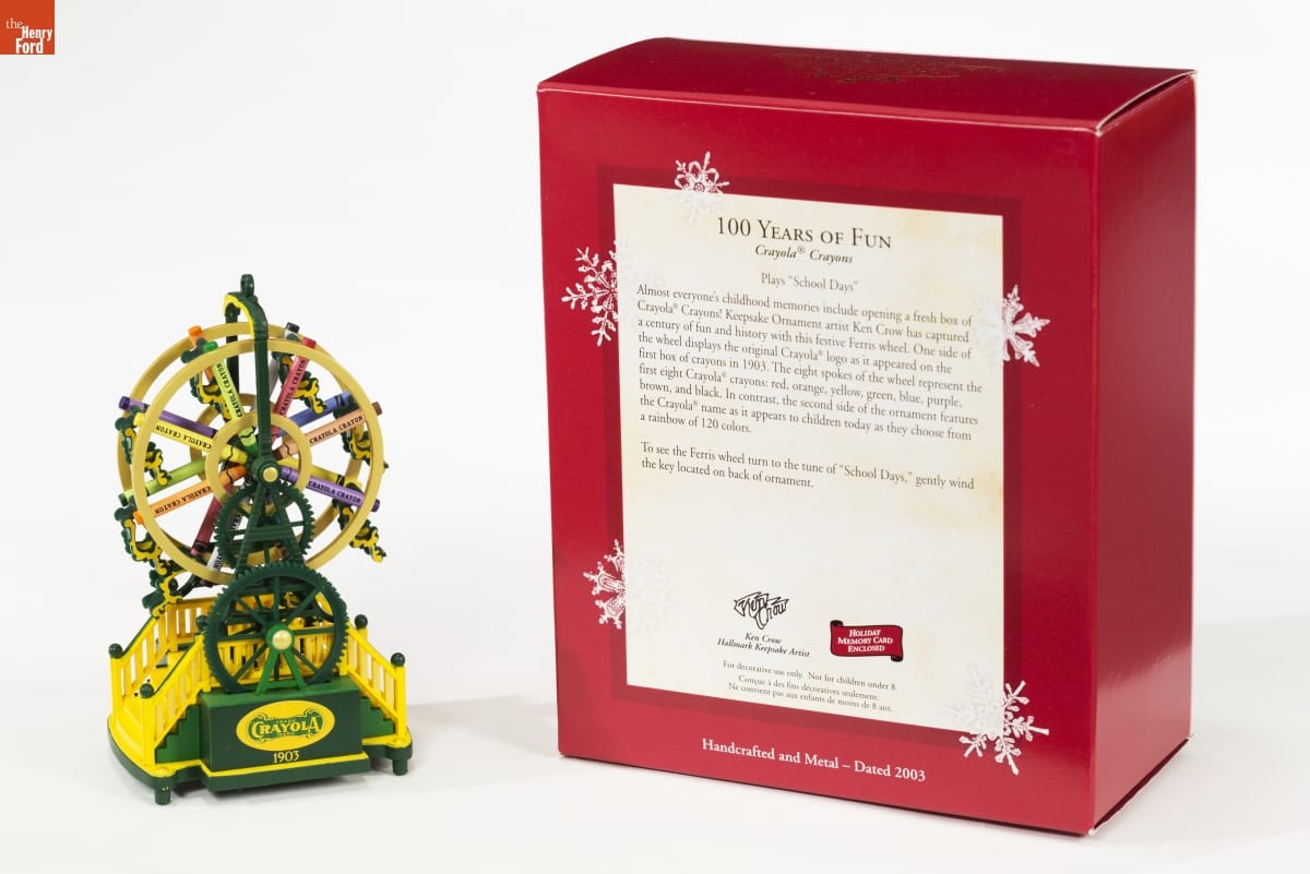 100 Years of Fun / Crayola Crayons / Plays "School Days" / Almost everyone's childhood memories include opening a fresh box of Crayola Crayons! Keepsake Ornament artist Ken Crow has captured a century of un and history with this festive Ferris wheel. One side of the wheel displays the original Crayola logo as it appeared on the first box of crayons in 1903. The eight spokes of the wheel represent the first eight Crayola crayons: red, orange, yellow, green, blue, purple, brown, and black. In contrast, the second side of the ornament features the Crayola name as it appears to children today as they choose from a rainbow of 120 colors. / To see the Ferris wheel turn to the name of "School Days," gently wind the key located on back of ornament. / Ken Crow / Hallmark Keepsake Artist / HOLIDAY / MEMORY CARD / ENCLOSED / For decorative use only. Not for children under 8. / [...] / Handcrafted and Metal - Dated 2003