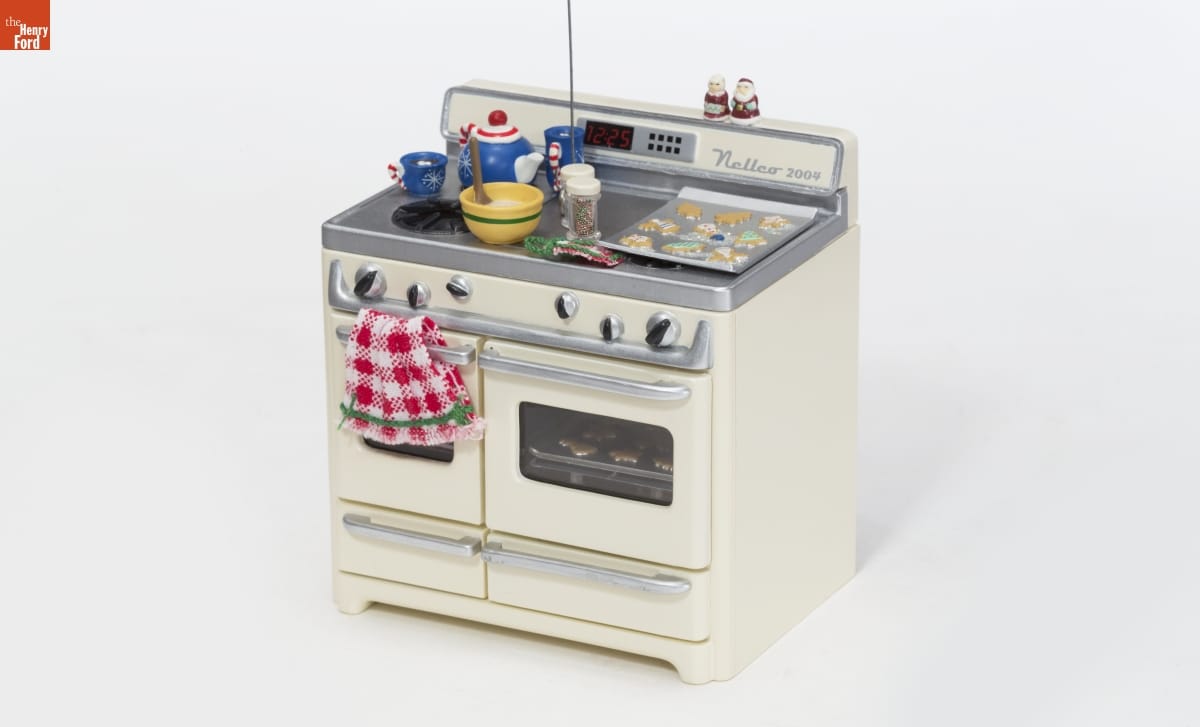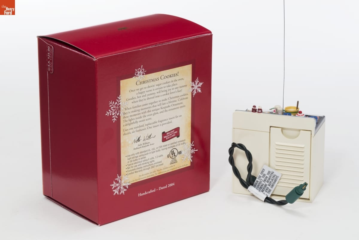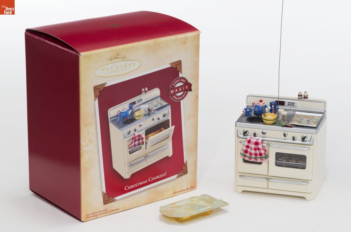 Already known for greeting cards, Hallmark introduced a line of Christmas ornaments in 1973. The company's annual release of an increasing array of ornaments revolutionized Christmas decorating, appealing to customers' interest in marking memories and milestones as well as expressing one's personality and unique tastes. The oven lights glow and a fragrance insert emits a sweet smell--warm sugar cookies just out of the oven!
