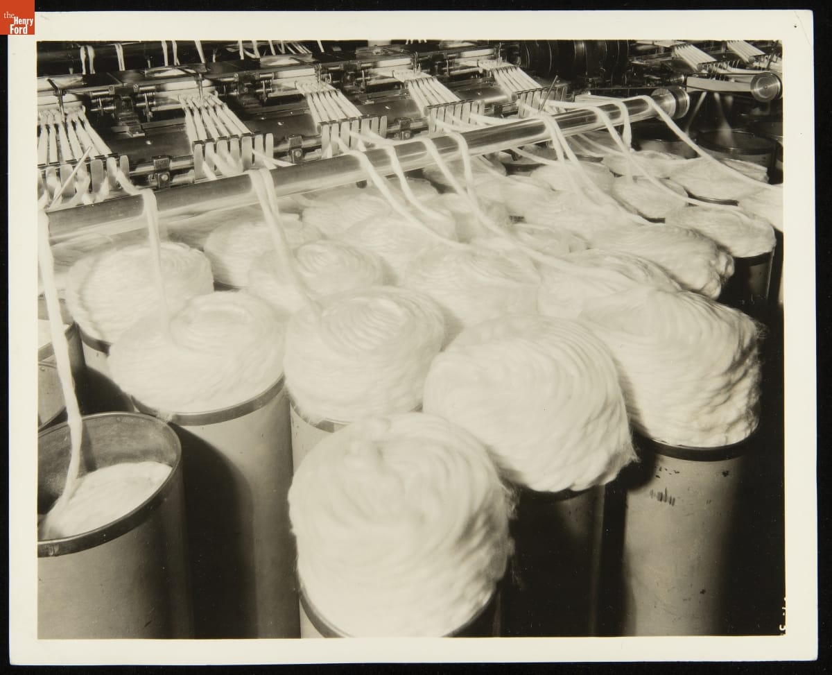 Large Thread from Combing Machines Wound into Cans, circa 1935