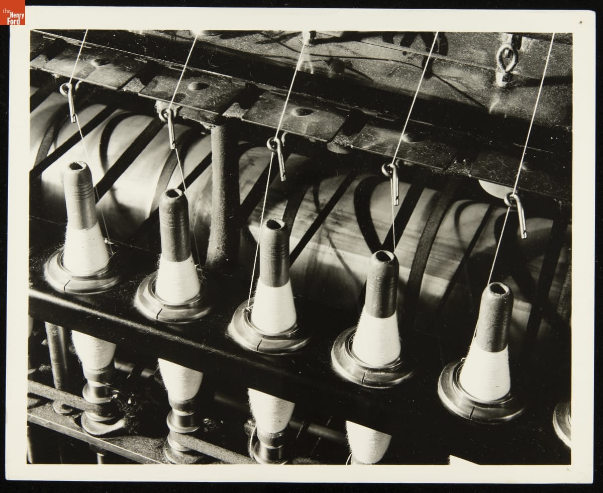 Close up of a Bobbin on a Textile Spinning Machine, circa 1935