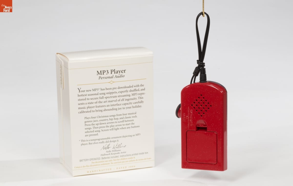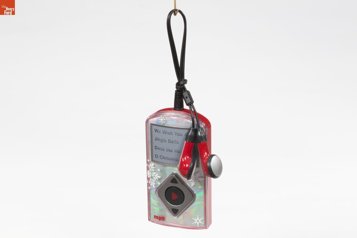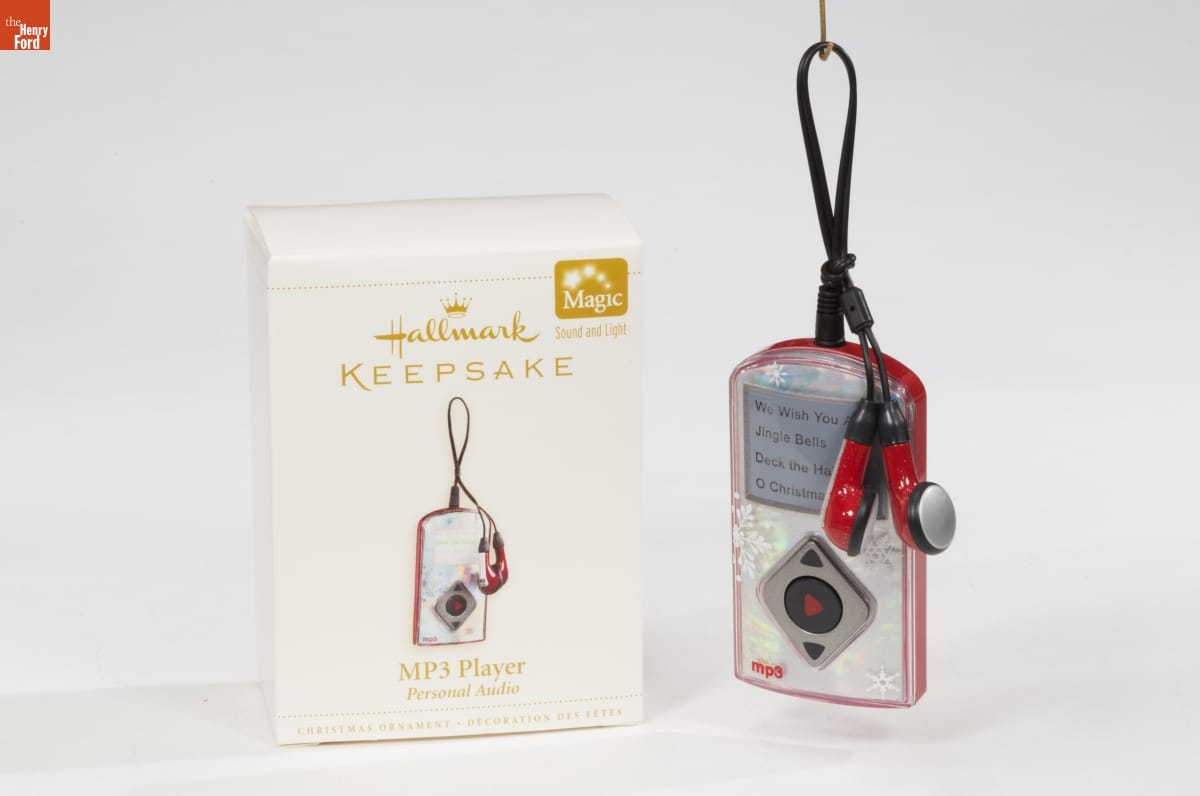 Listeners downloaded digital music into an mp3 player--a slim, small device that could hold more tunes than other large, clunkier devices that used physical media. This Hallmark ornament from 2006 plays four holiday songs from different music genres: jazz, country, hip-hop, and classic rock.