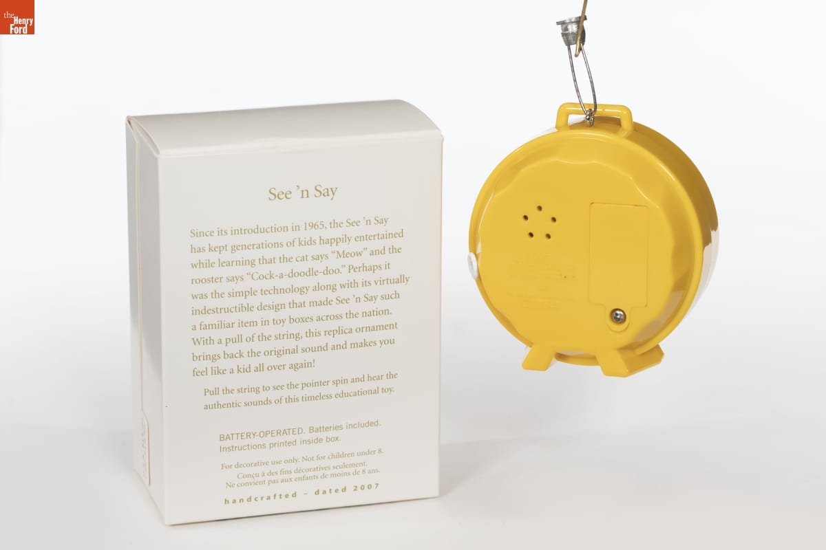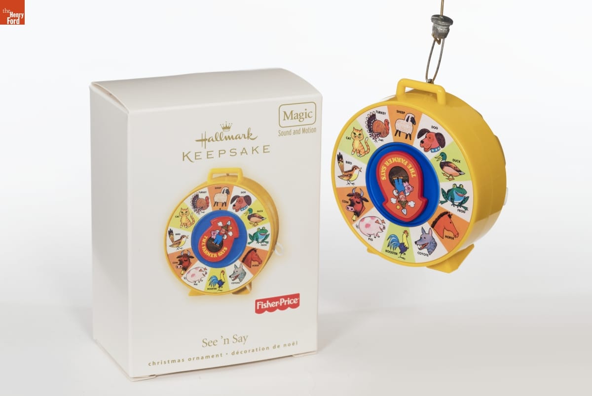 on front of ornament: THE FARMER SAYS on back of ornament: 2007 / (C) 2007 Mattel, Inc. / All Rights Reserved. / Hallmark Cards, Inc. / QXI7647 on front of packaging: Hallmark / KEEPSAKE / Magic / Sound and Motion / The Farmer Says / Fisher-Price / See n' Say / christmas ornament decoration de noel on back of packaging: See 'n Say / Since its introduction in 1965, the See 'n Say has kept generations of kids happily entertained while learning that the cat says "Meow" and the rooster says "Cock-a-doodle-doo." Perhaps it was the simple technology along with its virtually indestructible design that made See 'n Say such a familiar item in toy boxes across the nation. With a pull of the string, this replica ornament brings back the original sound and makes you feel like a kid all over again! / Pull the string to see the pointer spin and hear the authentic sounds of this timeless educational toy. / BATTERY-OPERATED. Batteries included. Instructions printed inside box. / For decorative use only. Not for children under 8. / [...] / handcrafted - dated 2007 on bottom of packaging: Fisher-Price and associated trademarkes are owned by and used under license from Mattel, Inc. (c) 2007 Mattel, Inc. / All Rights Reserved. / www.fisher-price.com / Mfd. for/Fabrique pour Hallmark Cards, Inc. / Kansas City, MO 64141 / Made in China QXI7647