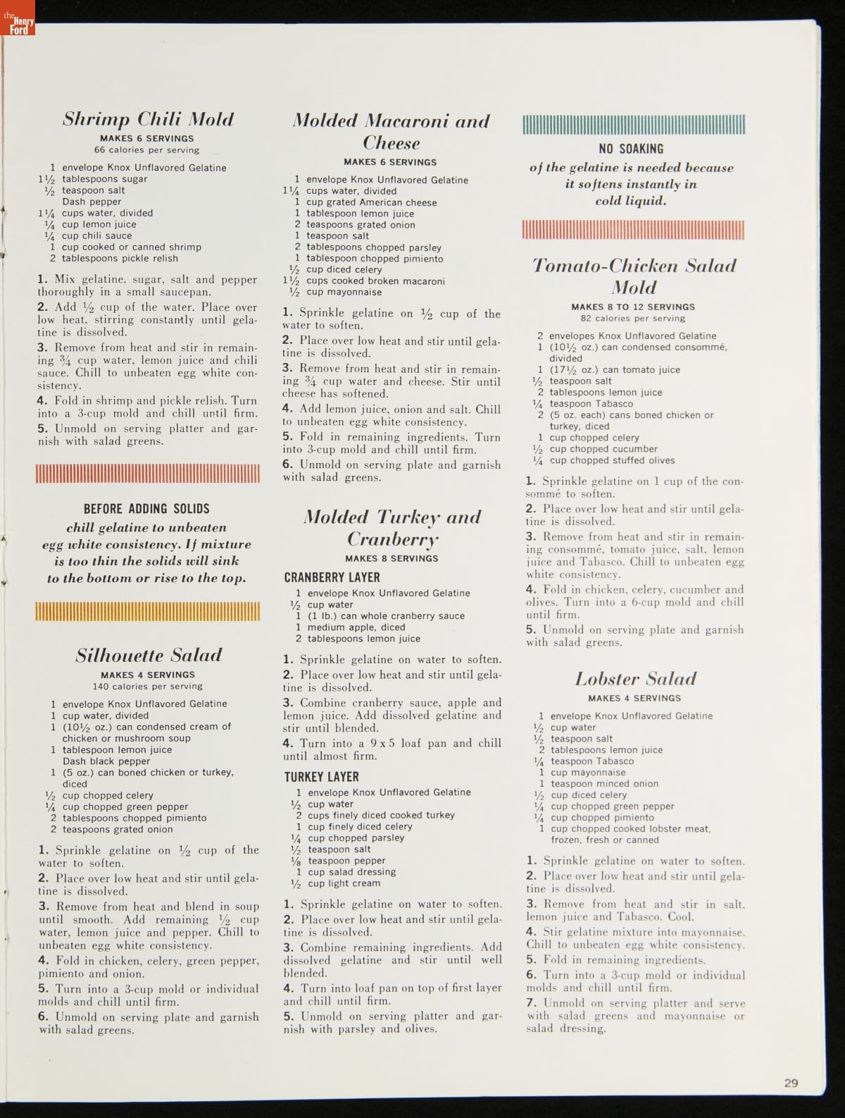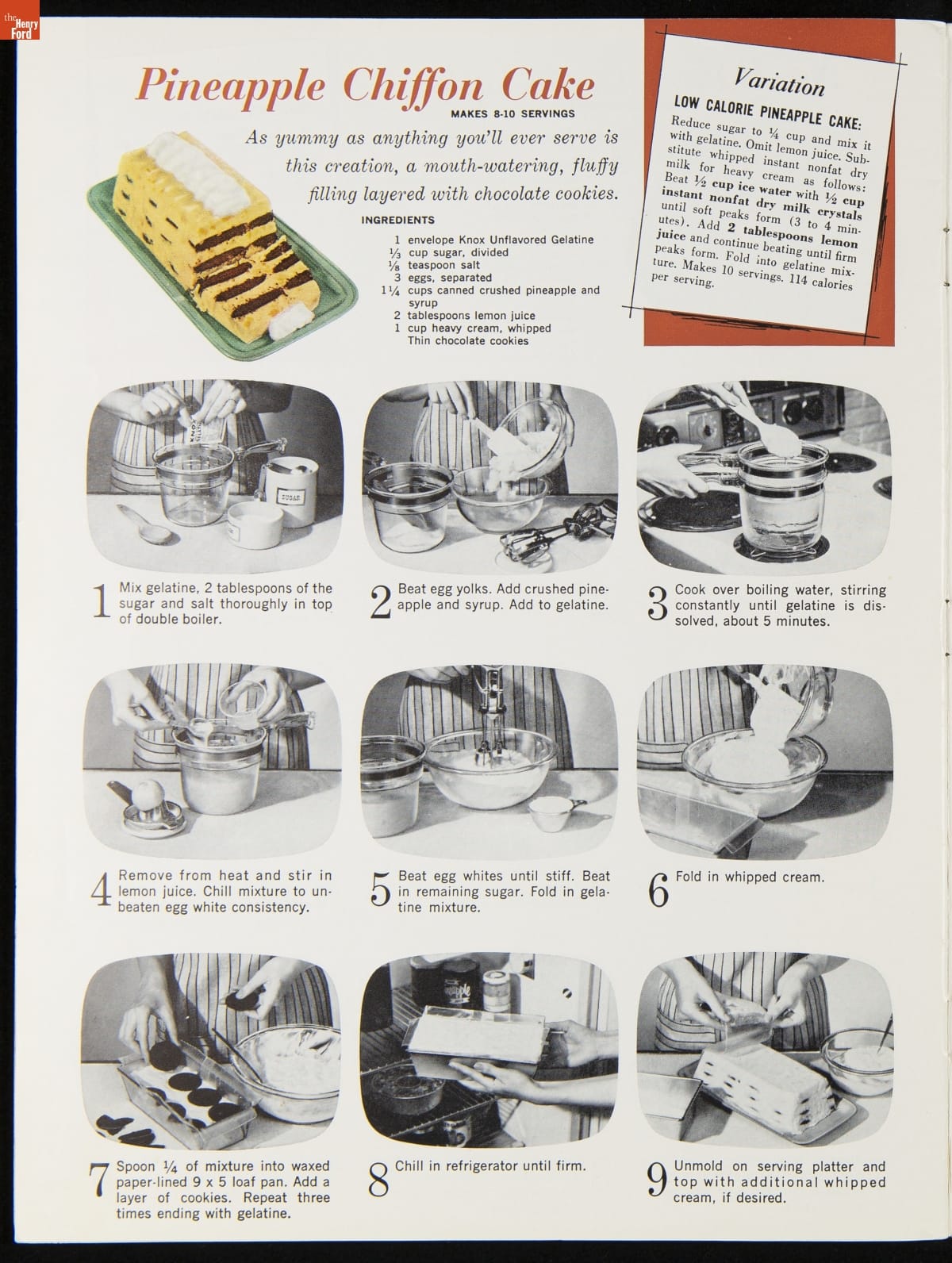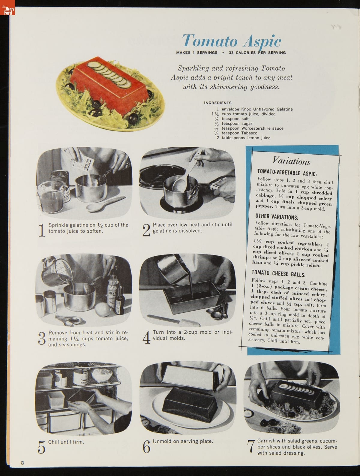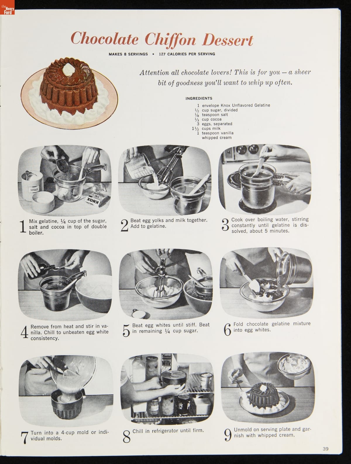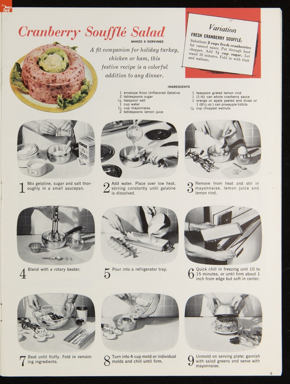Charles B. Knox revolutionized the use of gelatin in 1889 when he developed a method for granulating gelatin (before this, gelatin was sold in sheet form). When Knox passed away in 1908, his wife Rose took over the Knox Gelatine company, marketing its gelatin to American housewives. This booklet features easy-to-follow recipes with some accompanied by step-by-step photographs to document the process.