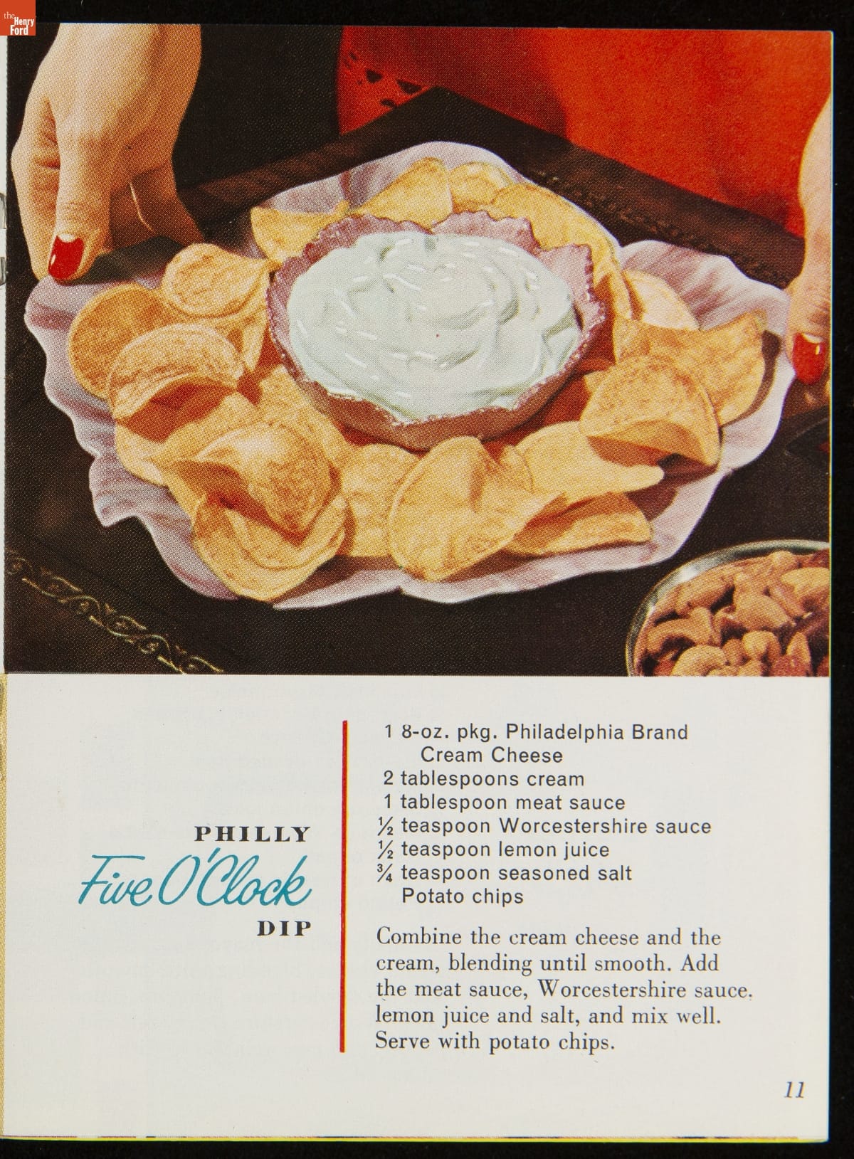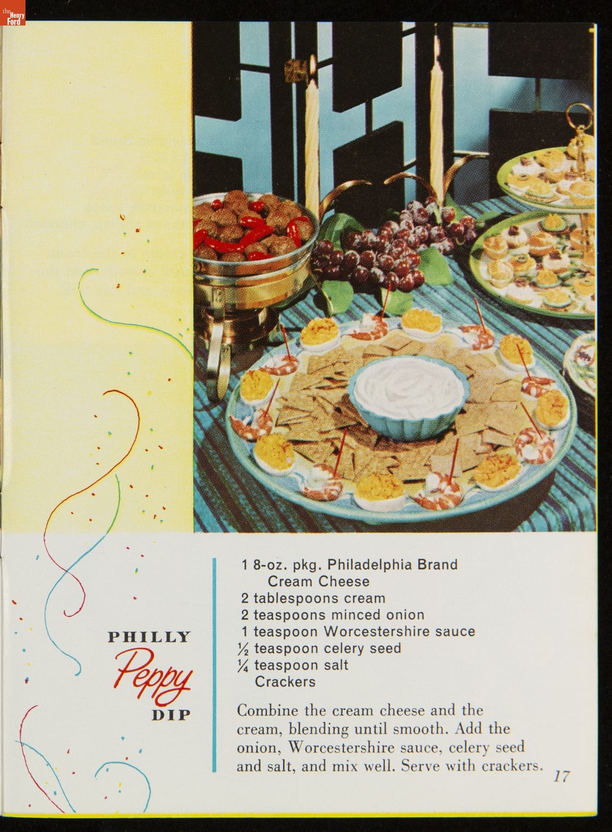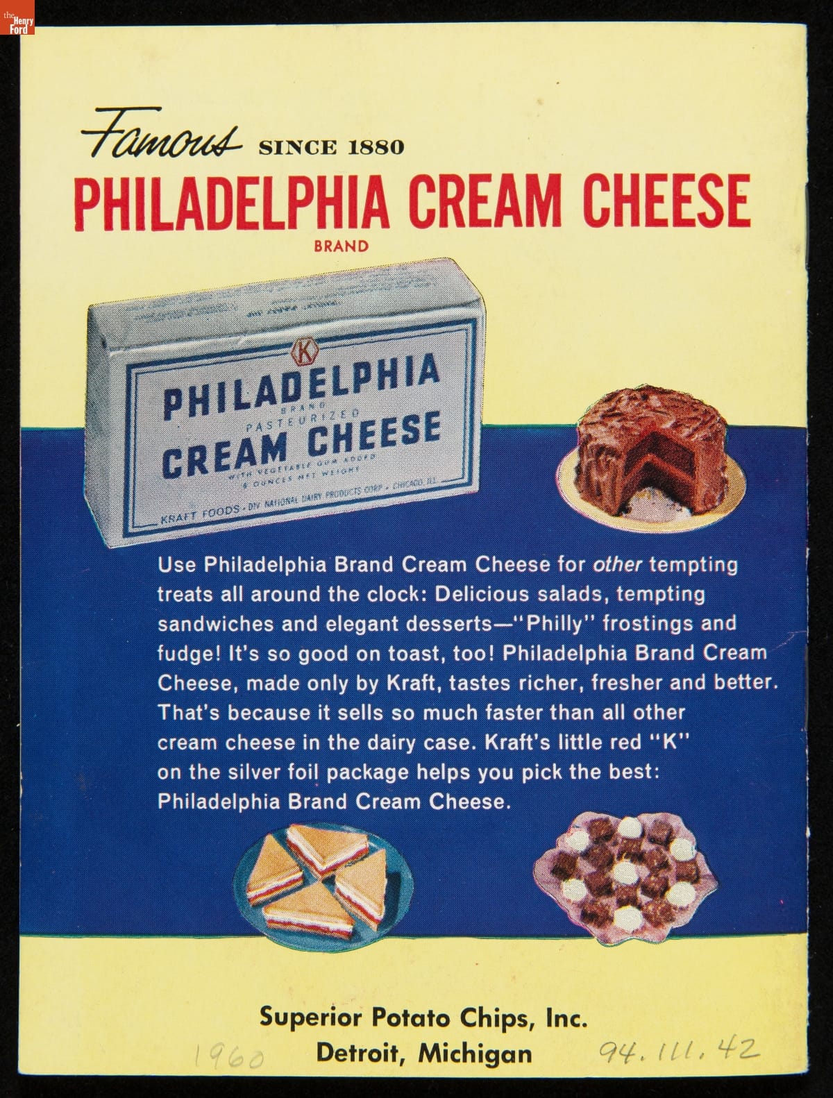 After adding more cream while making Neufchatel cheese (a creamy white cheese from France) New York dairy farmer William Lawrence discovered cream cheese and became the first to manufacture it in 1872. In 1880, the product was branded as Philadelphia Cream Cheese and its popularity prompted many creative uses over time. This booklet from 1960 includes recipes for using cream cheese in party dips.